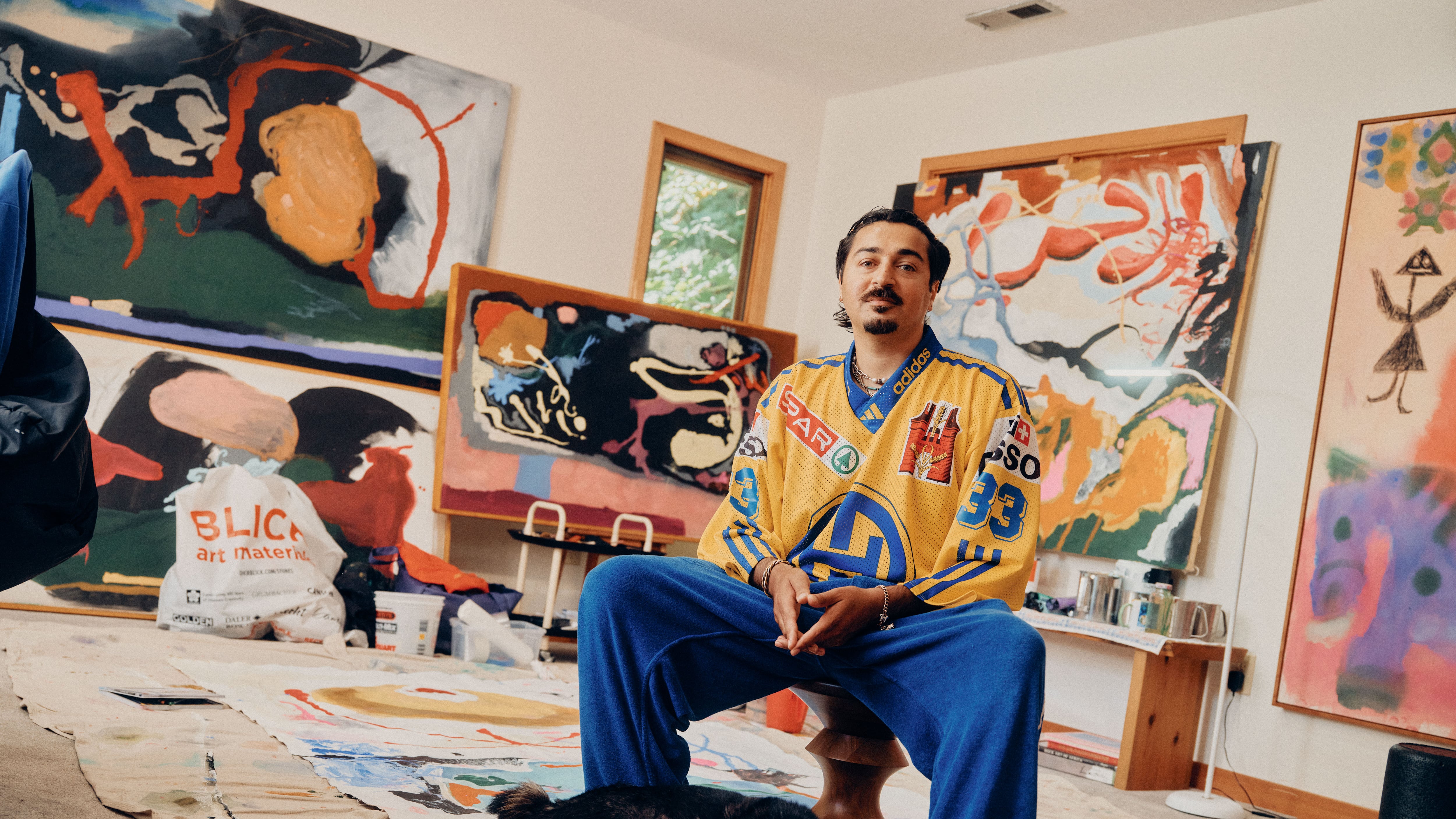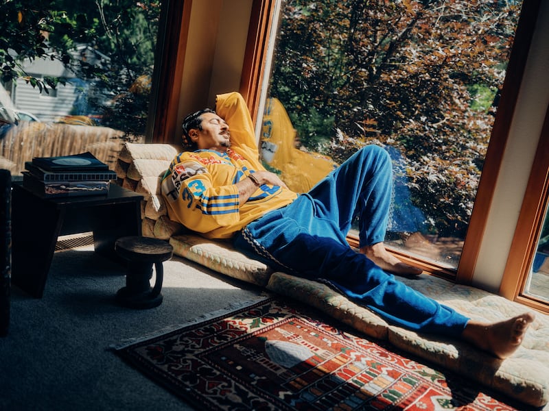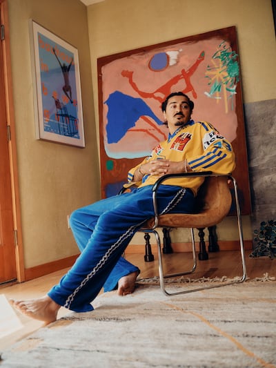 Godil’s studio is located on the top floor of the three-story home (the second story is reserved for bedrooms, a walk-in closet full of vintage soccer jerseys, and Godil’s fantastic bathroom, renovated with quartz counters and terrazzo floor tiles). Here, he works on his paintings, many of which are on display or in progress. At his desk, the psychedelic wabi-sabi Godil extols is apparent—a colorful, creative chaos familiar to anyone working from home. “You’ve got your crystals for energy, your reference books, oh, and here’s another prayer rug,” he says.