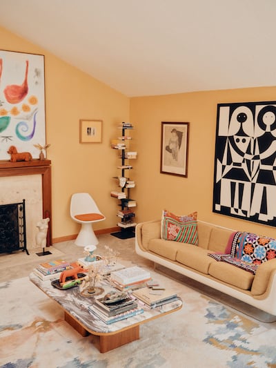 The melodic discord of the room reinforces his statement: A handcrafted hardwood chair with a carved trout as a backrest sits across from a gleaming white-and-orange Space Age seat and two Pierre Cardin dining chairs from the 1980s. An imposing black wood, African brutalist-style coffee table covered in culture-specific books centers the room. Under framed lithographs of Paul in a Clown Suit by Pablo Picasso, an Alexander Girard Black & White Environmental Enrichment Panel, and an untitled piece by Marc Chagall sits an ultramod white and beige couch where Godil’s grandmother’s quilt—a multihued work whose vibrant palette weaves its way through nearly every room of the home—rests on one arm.