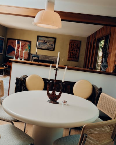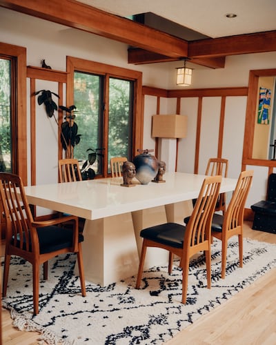 Such is the energy throughout the home: distinctly iconic yet brazenly divergent designs, all somehow complementing each other effortlessly. In the entryway, a Benin-era African mask welcomes visitors alongside contemporary Native American motifs. In the dining space, a stark white African brutalist dining table displays a Japanese raku-fired vessel flanked by two Native busts.