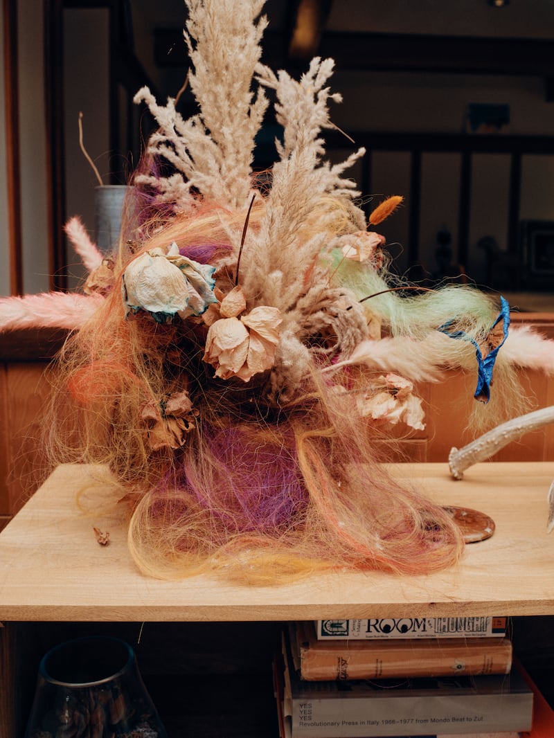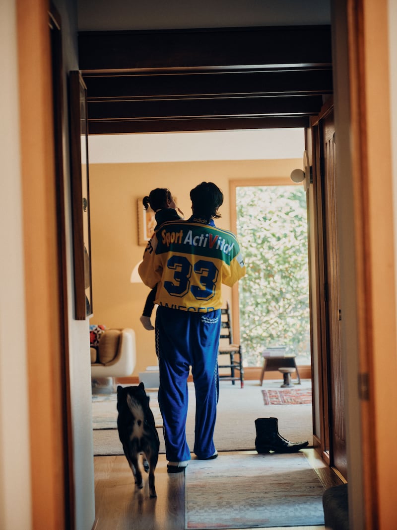 Godil’s studio is located on the top floor of the three-story home (the second story is reserved for bedrooms, a walk-in closet full of vintage soccer jerseys, and Godil’s fantastic bathroom, renovated with quartz counters and terrazzo floor tiles). Here, he works on his paintings, many of which are on display or in progress. At his desk, the psychedelic wabi-sabi Godil extols is apparent—a colorful, creative chaos familiar to anyone working from home. “You’ve got your crystals for energy, your reference books, oh, and here’s another prayer rug,” he says.