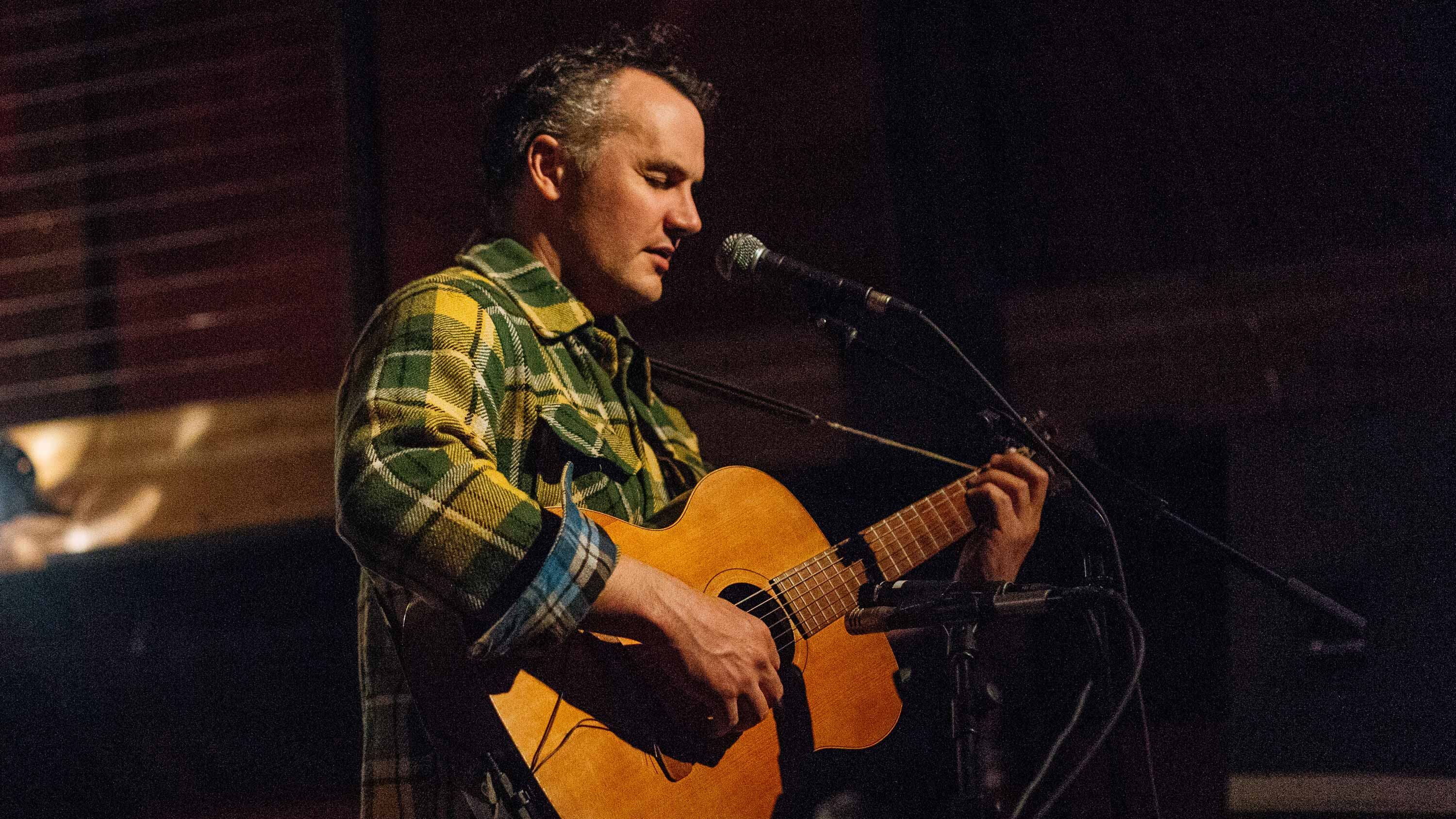At Mississippi Studios, wearing a green plaid flannel with red undershirt, he looked oddly comfortable onstage, by himself with just an acoustic guitar, singing with perfect articulation through sparse lyrics that are poetic in their frankness: “The last time it rained here you were alive still,” he sang on “Forest Fire.” “I watched you die in this room, then I gave your clothes away/Your transformed, dying face will recede with time, is what our counselor said.”