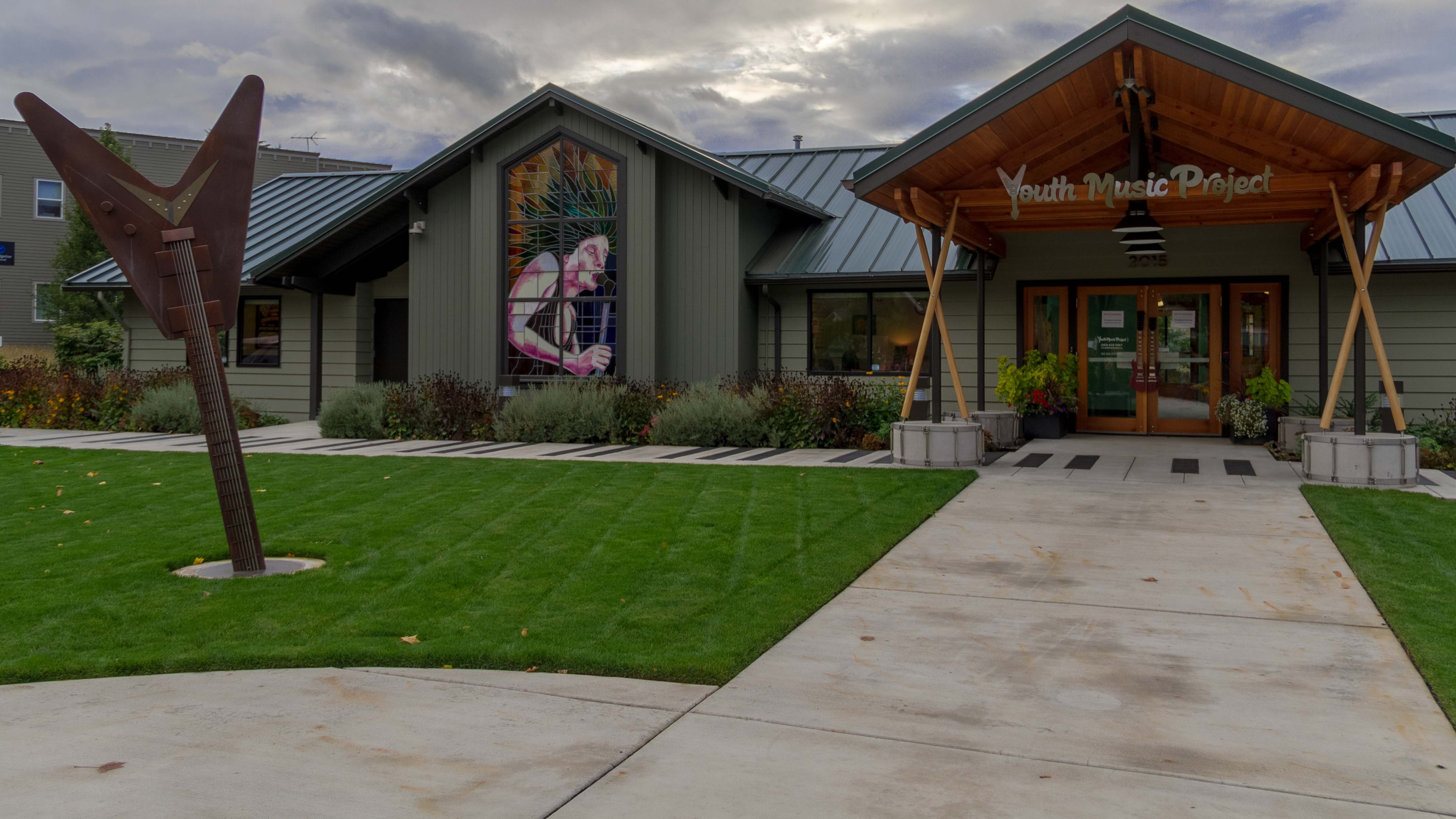 Despite limitations of space and a suburban setting rather far afield from most artists' stomping grounds, the Youth Music Project's playful kitsch-luxe aesthetic lends an EMP-styled flair—for example, that oversized Gibson Flying V sculpture buried neck-down in the site's front lawn—while the ready-made audience of kids arriving for subsidized lessons neatly confirms the guiding OMHOF ethos.