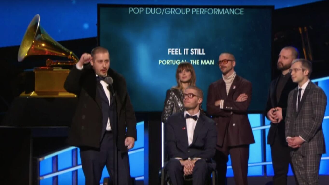 Last night, Portland-via-Alaska transplants Portugal the Man capped their miracle year by taking home a golden gramophone for their left-field smash "Feel It Still" in the Best Pop Duo/Group Performance category, beating out the likes of Imagine Dragons, the Chainsmokers and "Despacito"—making them the second Portlanders to beat out Justin Bieber on Grammy night.