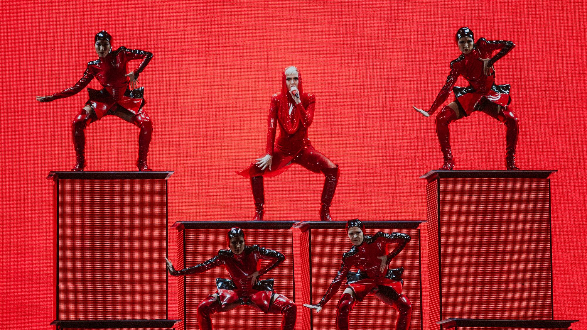 Arriving through a cloud of smoke on a levitating platform, draped in sparkly red, she performed in front of an eye-shaped video screen whose pupil would open to reveal the next oversized set piece: a pixelated lion's head for "Roar," the aforementioned massive red lips for "I Kissed a Girl," a basketball hoop the size of an aboveground pool for "Swish Swish." A portion of the set had a "Tim Burton reboot of Honey, I Shrunk the Kids" motif, with a male dancer doing a pole routine on a giant rose stem. And yes, Left Shark, the meme sensation from her Super Bowl performance three years ago, indeed made a cameo—they did the Kid n' Play dance together, then wrestled on her curved catwalk.