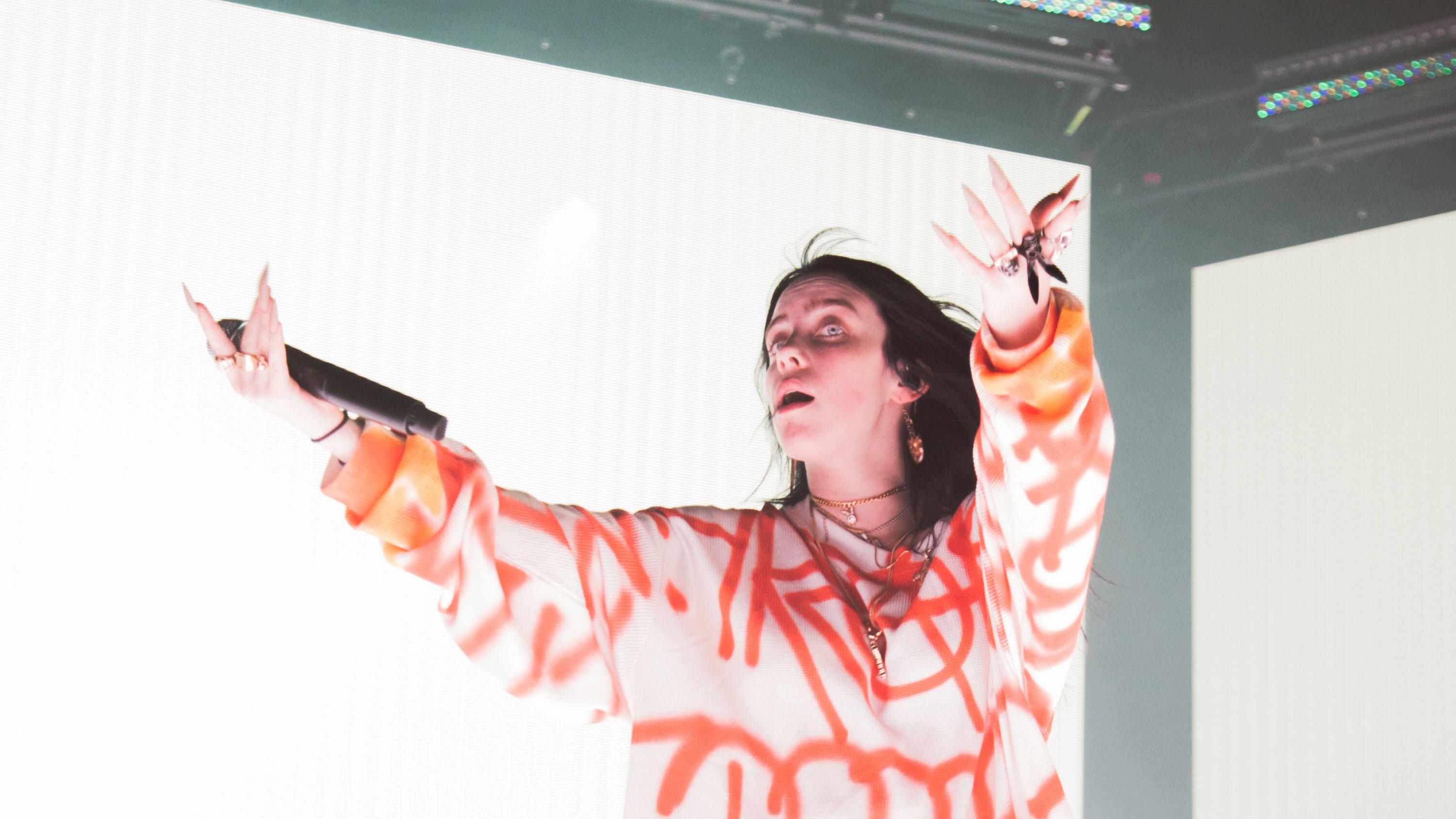 She seemed to have as much fun as they did. The concert marked the third U.S. city on Eilish's global tour behind her new album, When We All Fall Asleep, Where Do We Go? Eilish isn't a traditional pop star, preferring form-shrouding streetwear that's more athletic than what her contemporaries typically wear. She's like Lorde's creepy, Tyler the Creator-obsessed little sister. Wearing an oversized, graffiti-decorated sweatshirt with baggy shorts, claw nails and colorful rings, Eilish hopped confidently around a stage that pulsed lights and a mix of safely nightmarish images—spiders, deep-sea fish, Roman statues turning to skeletons and dust, dozens of shining eyes from a dead forest.