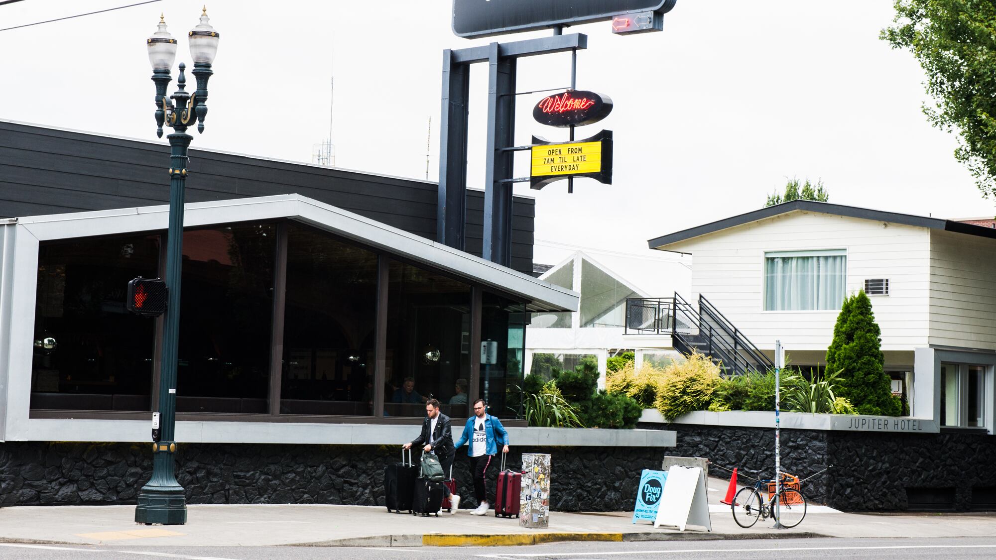 Last July, Jupiter Original began to host overnight guests following an initial pandemic closure and stint as a COVID ward for houseless people. Before relaunching with a Comeback Tour party, the property underwent extensive renovations. All 81 rooms were completely redesigned—a joint project between owner Bunker and Northwest firm Megan Millie Design. The refresh included music-themed murals—which was meant to bring a bit of the neighboring rock venue Doug Fir into the hotel—as well as new furniture, like pillow-top platform beds and lounge areas with couches.