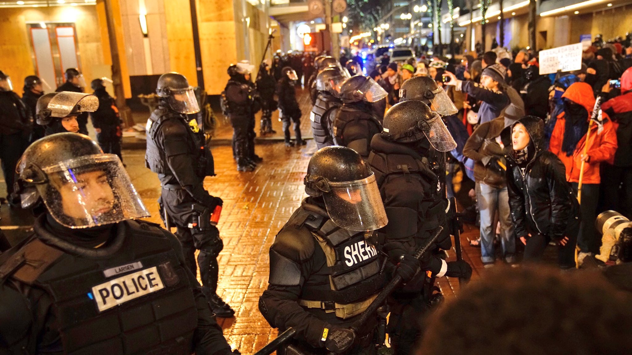 Police soon began clearing protesters out of Tom McCall Waterfront Park, calling the protest an "unlawful assembly." They cited protesters throwing ice balls and eggs as a reason for the show of force.