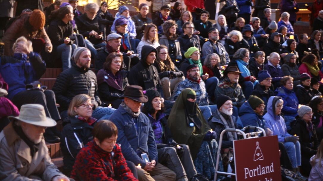 Four religious groups—including one Muslim and one Jewish organization—held a vigil in Pioneer Courthouse Square on Sunday night, holding battery-operated tea lights in 30 minutes of quiet.