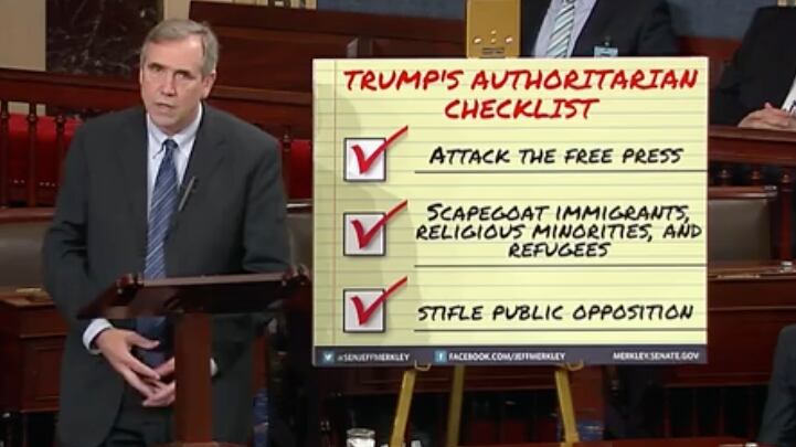 "Throughout his candidacy, and now within the walls of the White House, President Trump has viciously, repeatedly attacked the media. He has inflamed people's anger toward immigrants, toward religious minorities, toward refugees. And he has undermined or attacked individuals who publicly stand up to him and the shortcomings of his policies," Merkley said. "These are strategies of authoritarian leaders throughout history, and are incompatible with our government. We must call out these strategies, and we must resist these strategies."