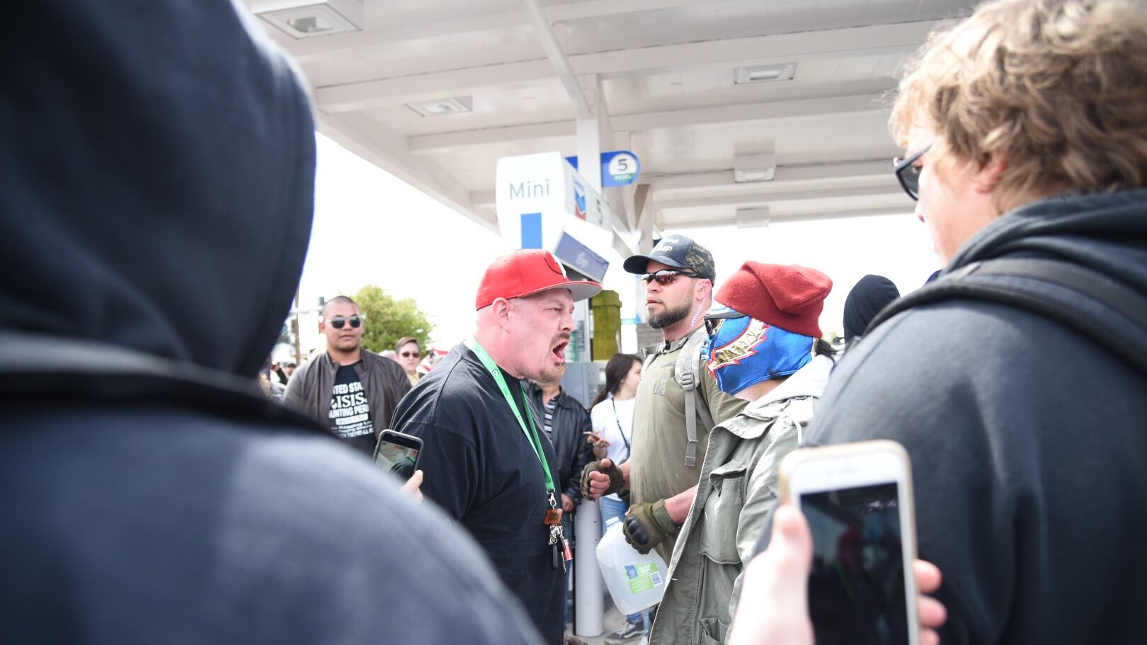 The march erupted into minor scuffles along the route: Once, a man wearing a shirt with the face of a jack-o-lantern was hauled away in cuffs. When a man wearing an American flag as a cape egged on counter protesters in a Chevron station parking lot, police formed a circle around him.