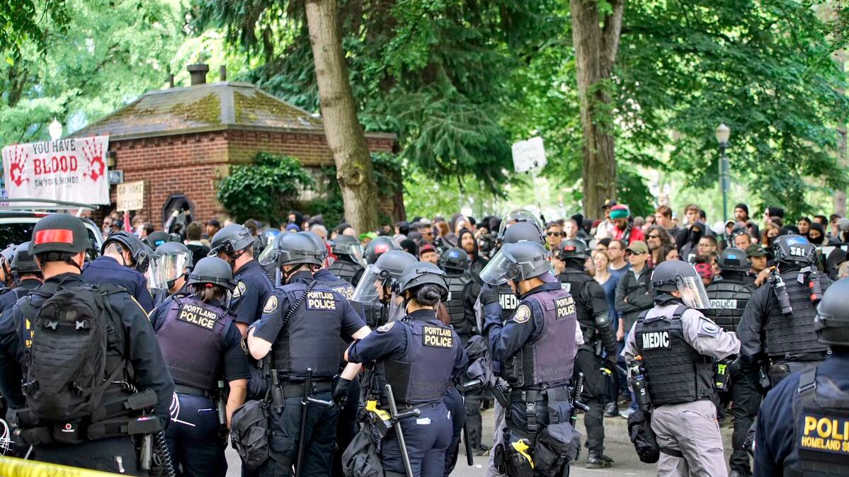 Portland riot police forcefully muscled antifascist protesters out of Chapman Square this afternoon as an alt-right rally continued across the street.