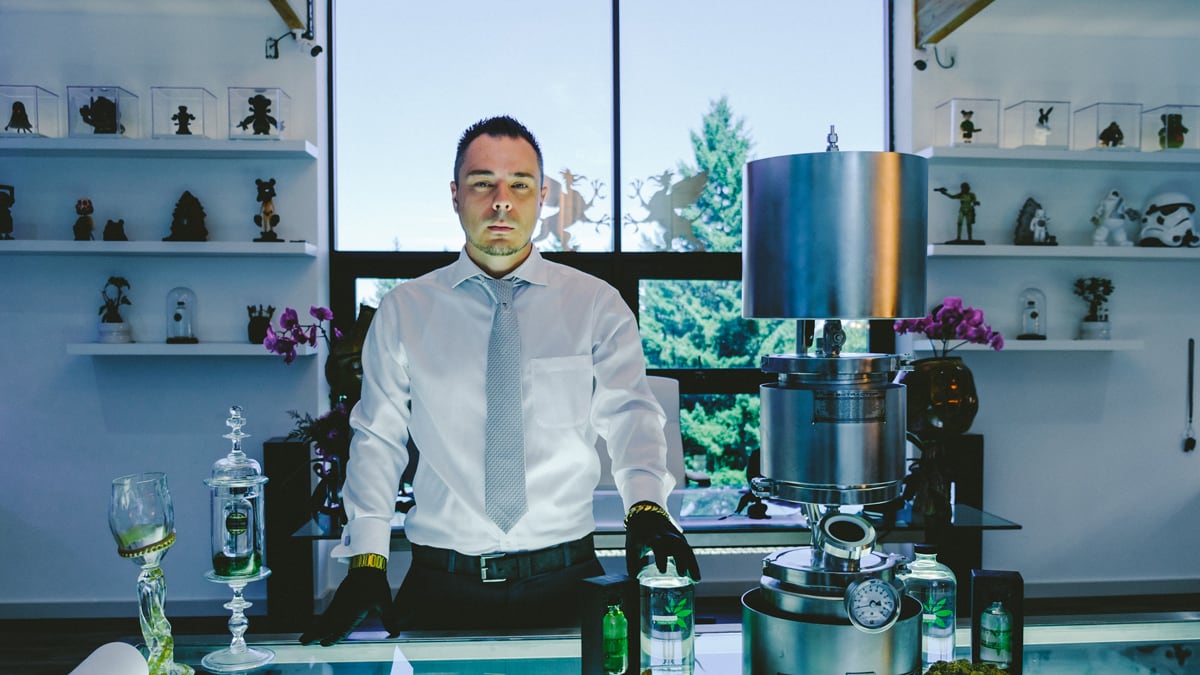 Crisp white walls, beakers full of terpenes—a blend Jones mixes to make extracts taste better—and a massive flat-screen television adorn his workspace. It's a long way from Ellis' quaint Woodstock lab.