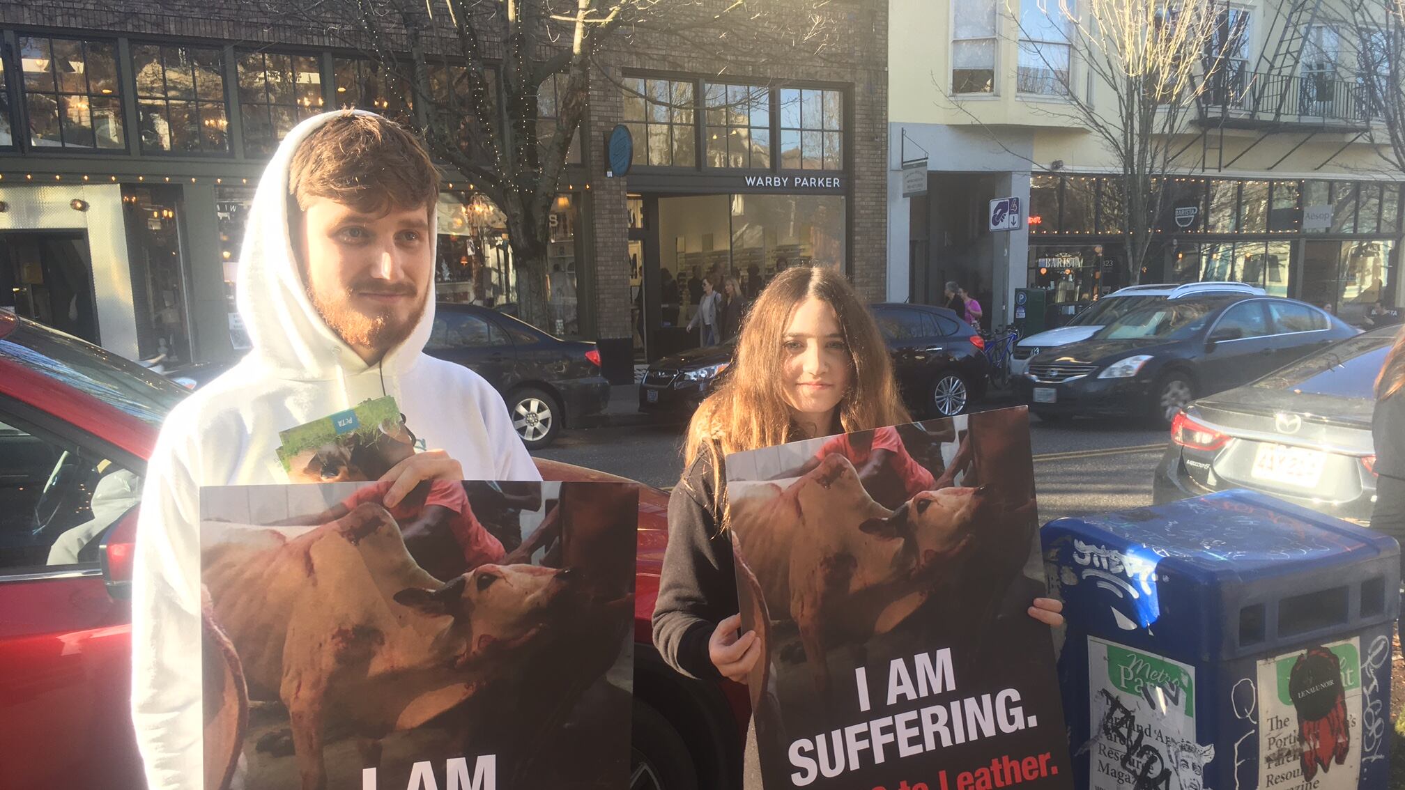Lining the sidewalk in front of the store, the protesters passed out PETA fliers, held signs and played a documentary on animal cruelty from a laptop as shoppers passed by.