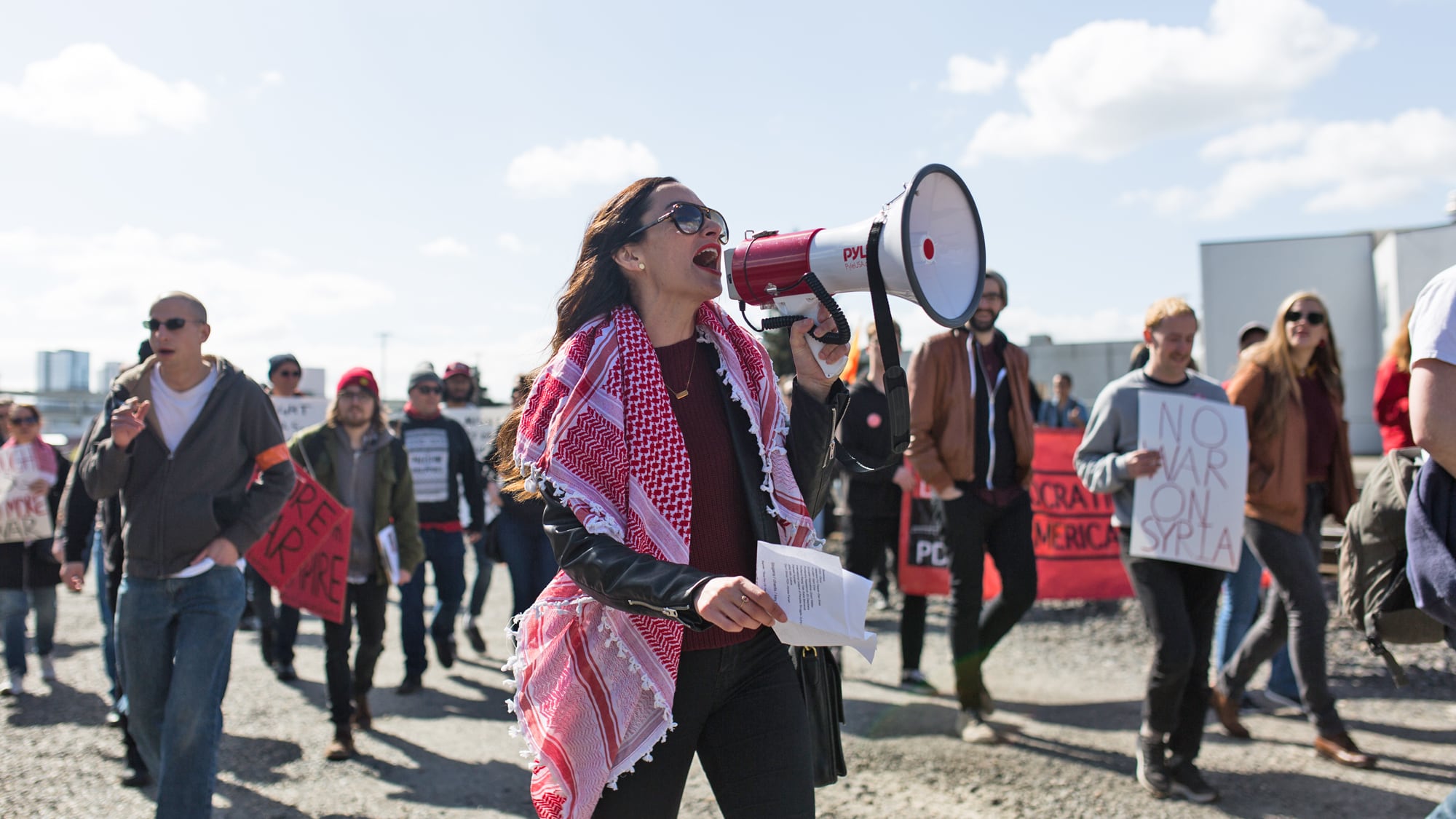 Her rallying speech was brief: critical of Brown and Wheeler, whom she denounced as imperialists, and centered on her Jordanian heritage. As she spoke against President Donald Trump's recent airstrike on Syria, and of her fear for her grandmother who lives in Damascus, the 50-strong crowd offered sympathetic hums and gentle snaps of their fingers.