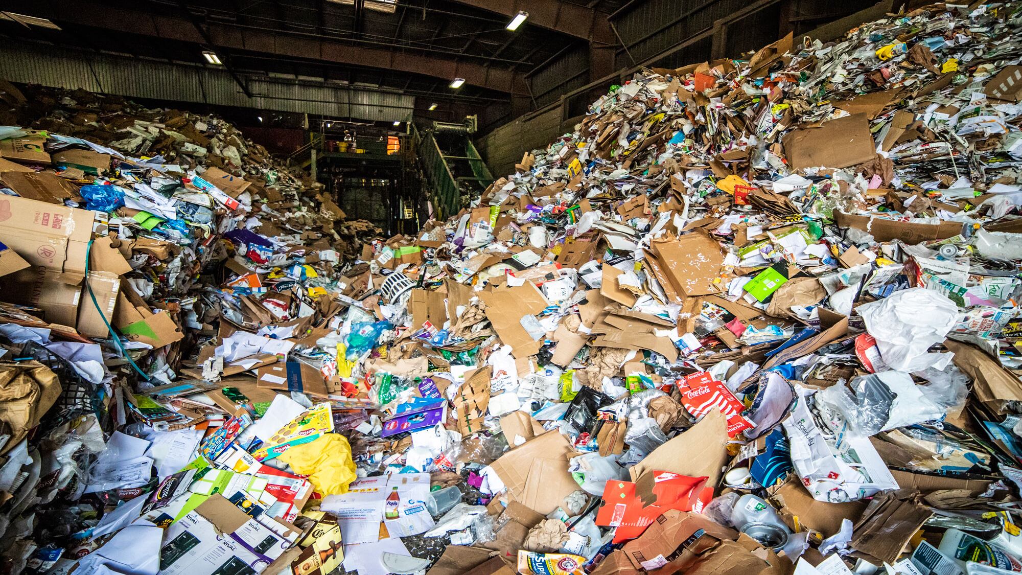 The trucks disgorge their loads on a concrete apron the size of a soccer field. Beeping front-end loaders pile up the debris so it can enter a series of conveyor belts that will produce giant bales of mixed paper, plastic and metals.