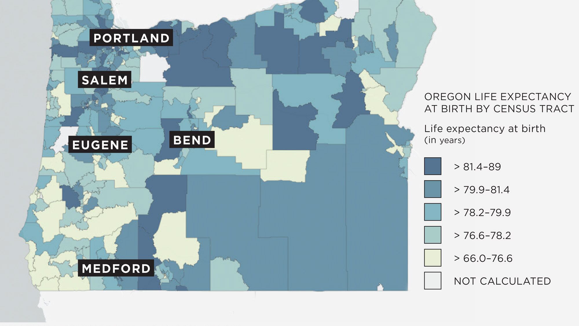 The socio-economic differences between richer and poorer areas in the state can translate into significantly different life spans—the average Oregonian born in more prosperous census tracts can expect to live an average of 85.2 years, while those born in the poorest areas may live an average of just 71.3 years.