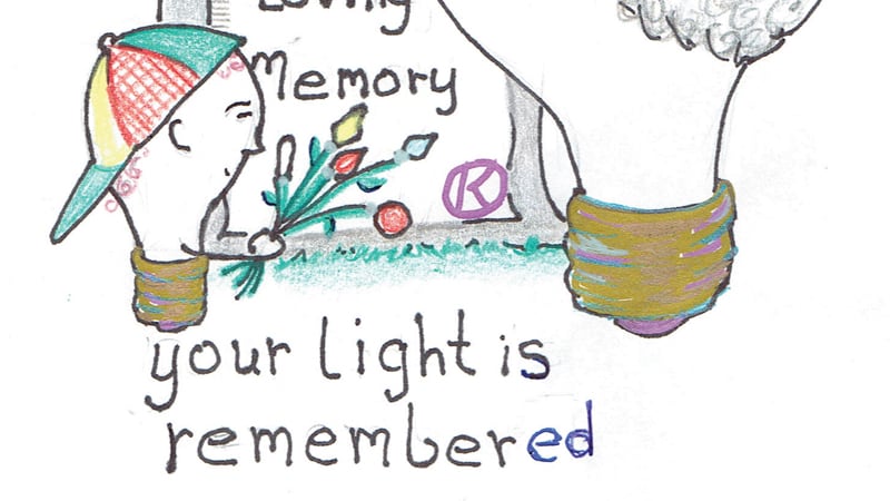 In one, a bulb drinks a beer while handing its car keys to another bulb. Another ad features a father and son at the grave of a loved one, with a line reading, “Your light is remembered.” Once, she turned the captain of the Portland Spirit into a cartoon bulb. When one piece turned out crooked, she couldn’t bear to start over—so she put a bandage on its head and made it look sick.