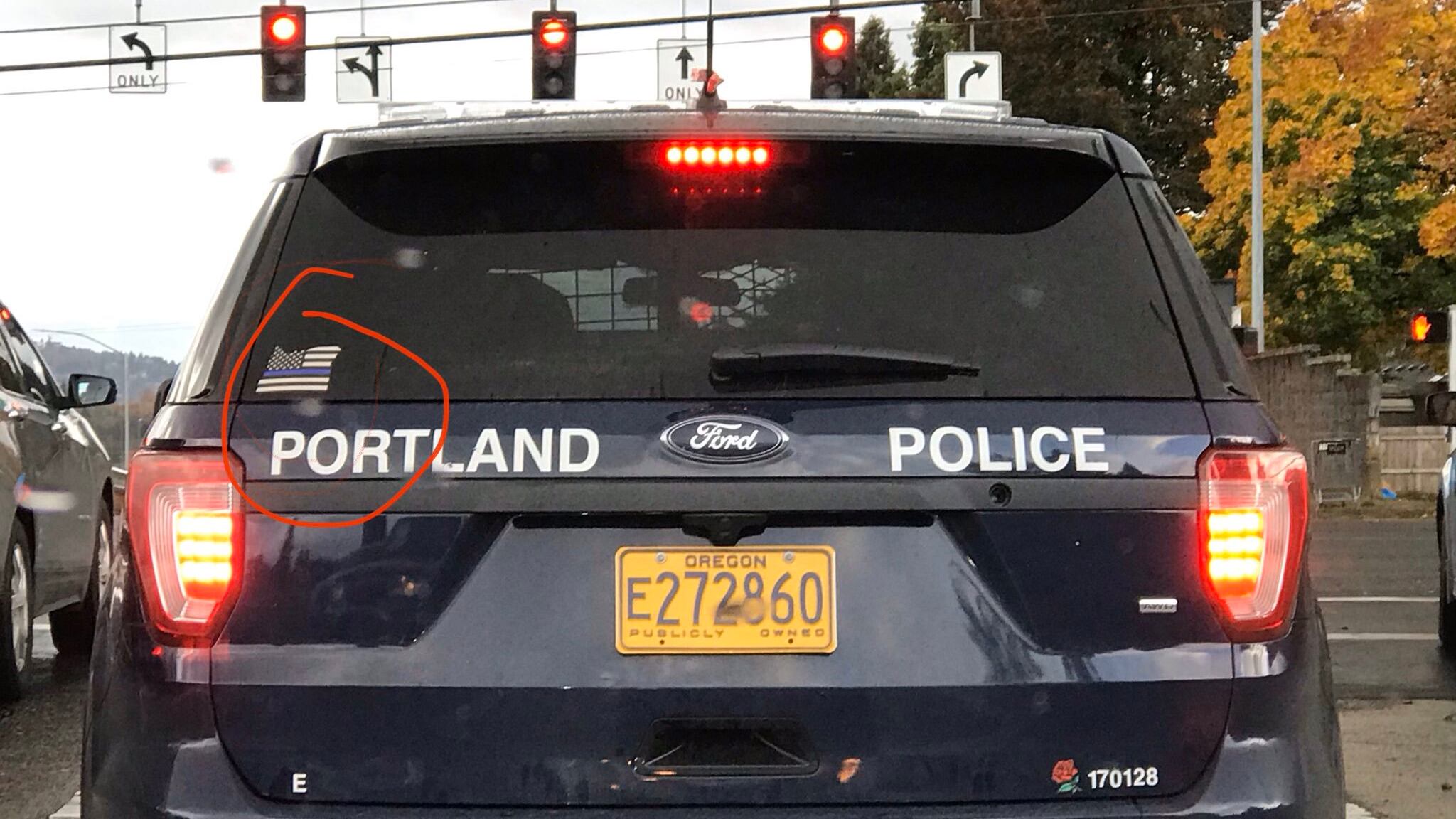 That's a violation of City of Portland policy. According to rules about visual markings for city vehicles, no "private decals or markings are allowed," on police vehicles.
