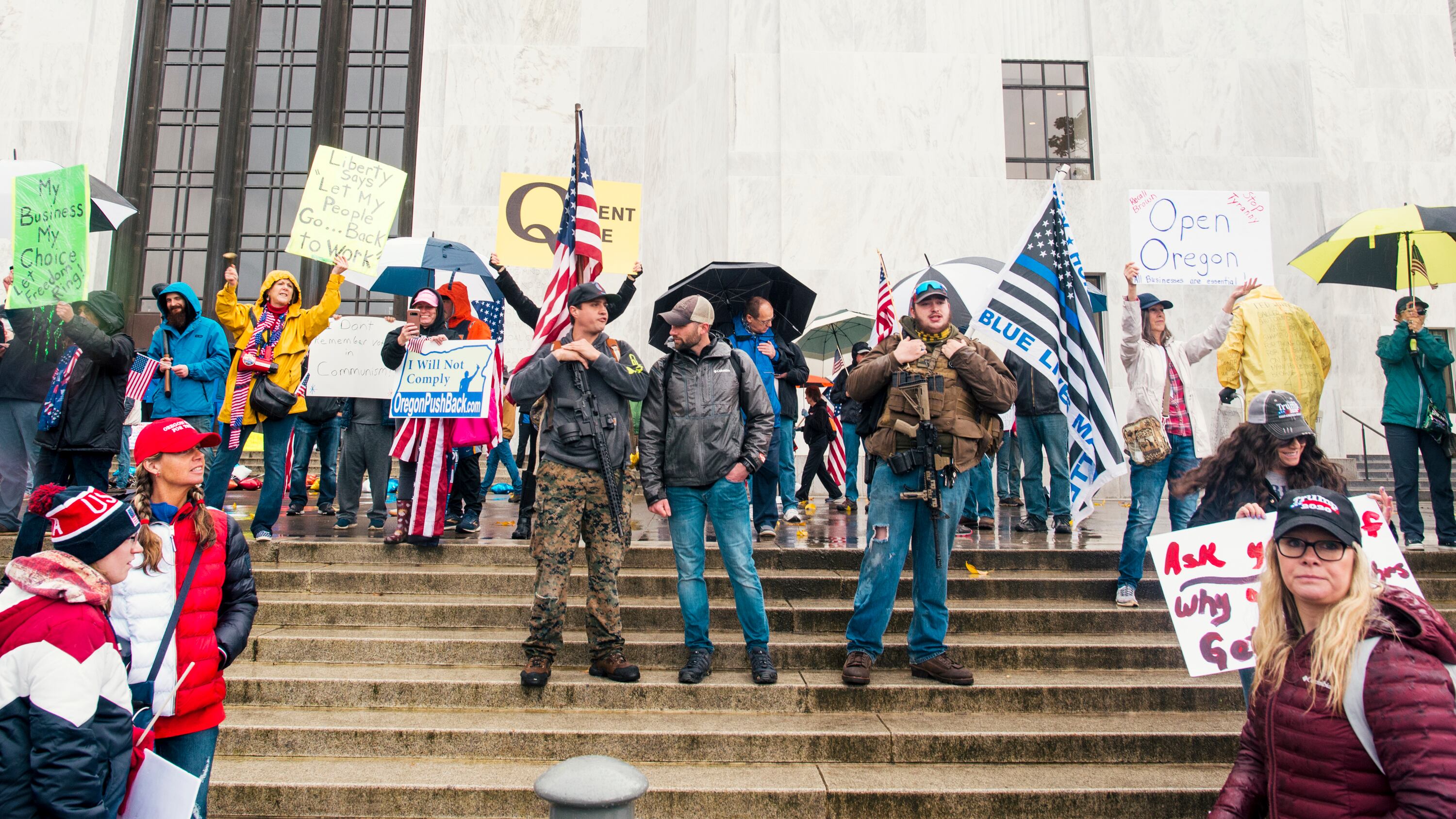 The QAnon movement has gained a higher profile in Oregon in the past year, thanks in part to its presence at conservative protests of Gov. Kate Brown. QAnon slogans were displayed on the Oregon Capitol steps twice: at Timber Unity protests of a carbon emissions cap in 2019, and at a rally against stay-home orders on May 2.