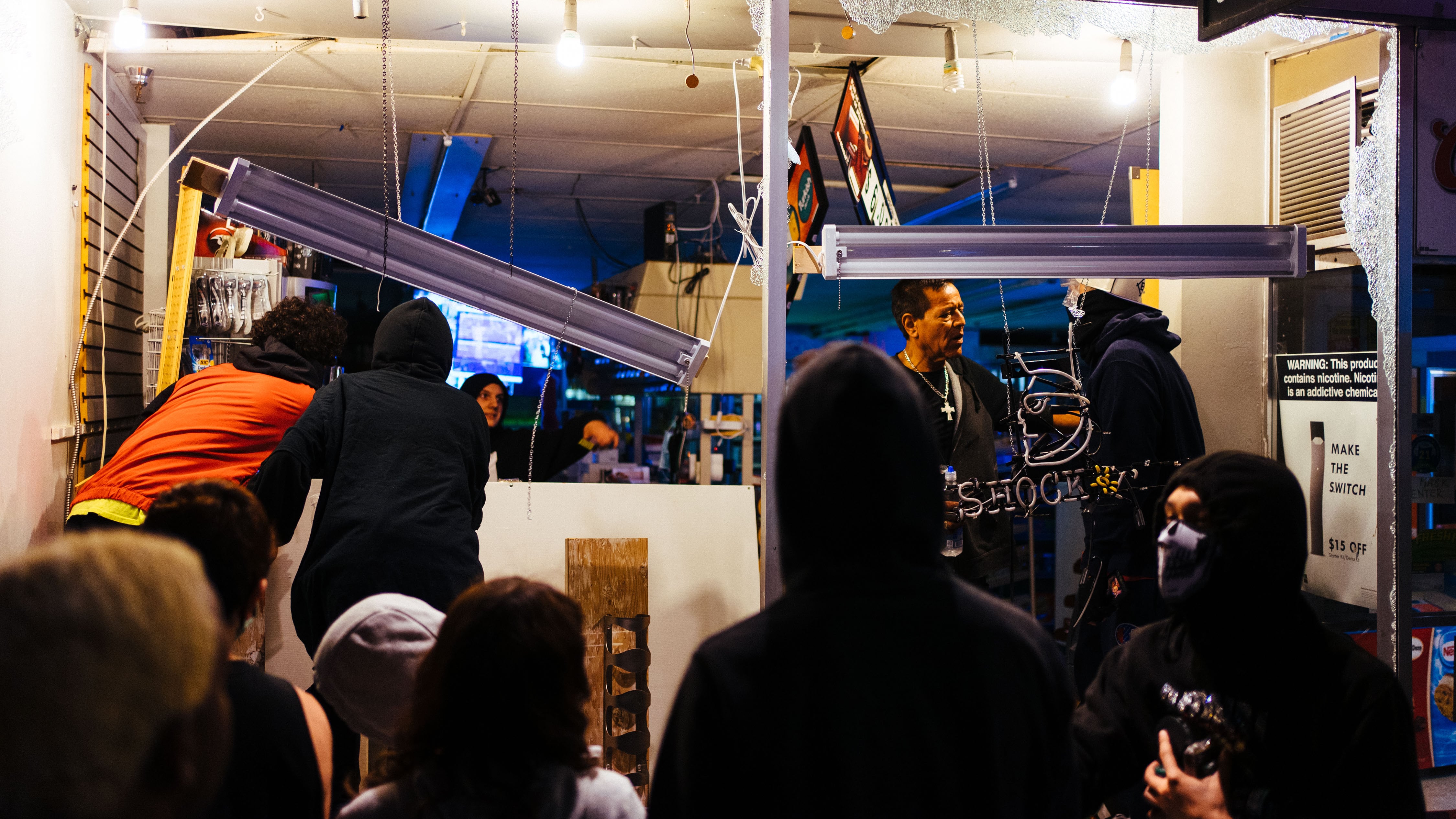 But the damage was intense: Rioters smashed the windows of dozens of stores. They raided the shelves of a CVS Pharmacy and a locally owned cigarette shop. They snatched products from the Apple Store and sprinted up the escalators at the City Target. Some people set bonfires—including outside a pharmacy.
