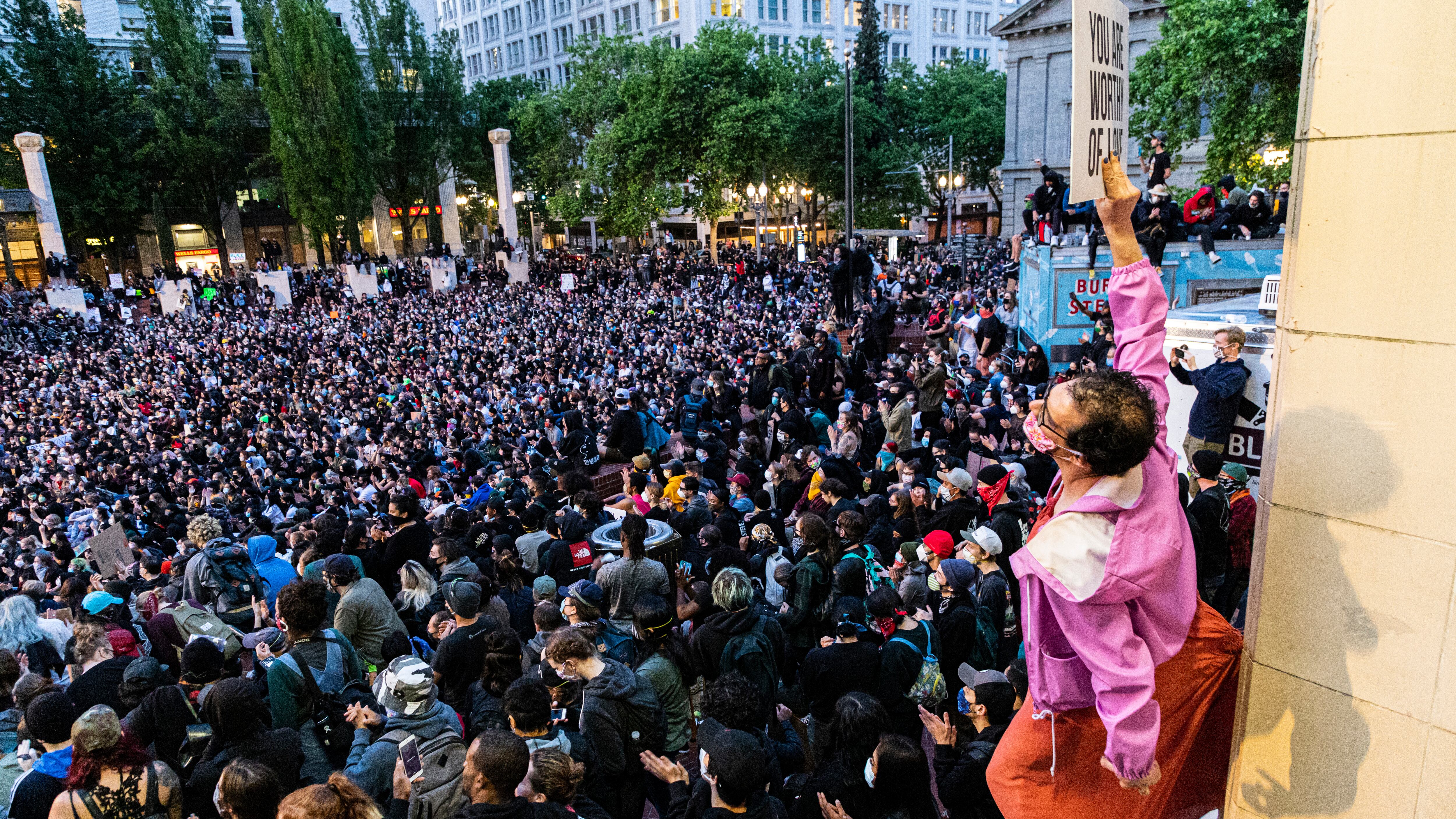 Groups arrived in Pioneer Courthouse Square from across the city, on the first night after Mayor Ted Wheeler lifted a citywide curfew. The throng that held a "die-in" on the Burnside Bridge—lying down on the pavement—stretched from one bridgehead to the other. It took 15 minutes for that group to stream off the bridge into downtown. And that was just a portion of the people arriving in the square.