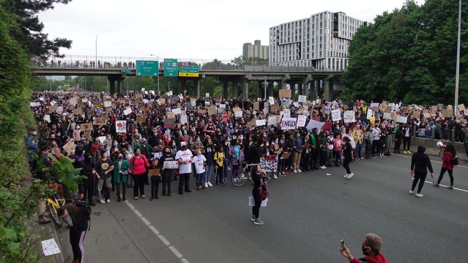 A crowd of thousands took over both directions of Interstate 84 during Monday's march in the uprising against police officers killing black people, Portland's 11th consecutive night of mass protest.