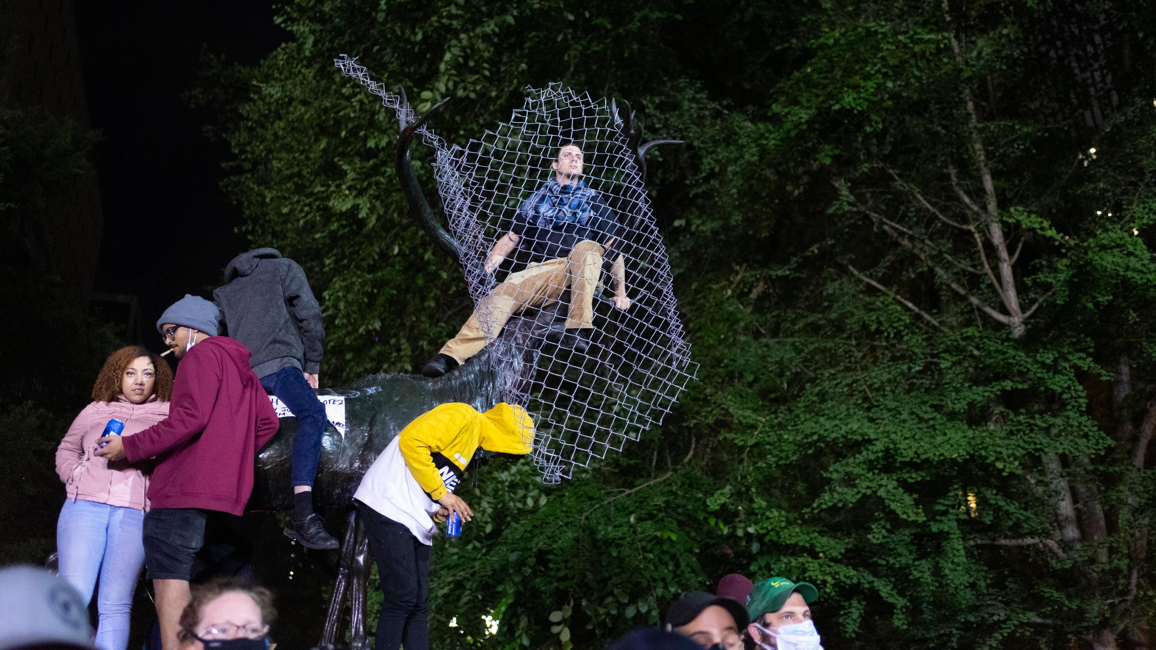 The elk statue was erected in 1900 in honor of David P. Thompson, who served as mayor of Portland from 1881 to 1885, according to The Oregonian. It has regularly been at the center of protests—people climbed atop the animal to kiss during the last night of Occupy Portland protests, and protesters draped portions of a fence from its antlers last month.