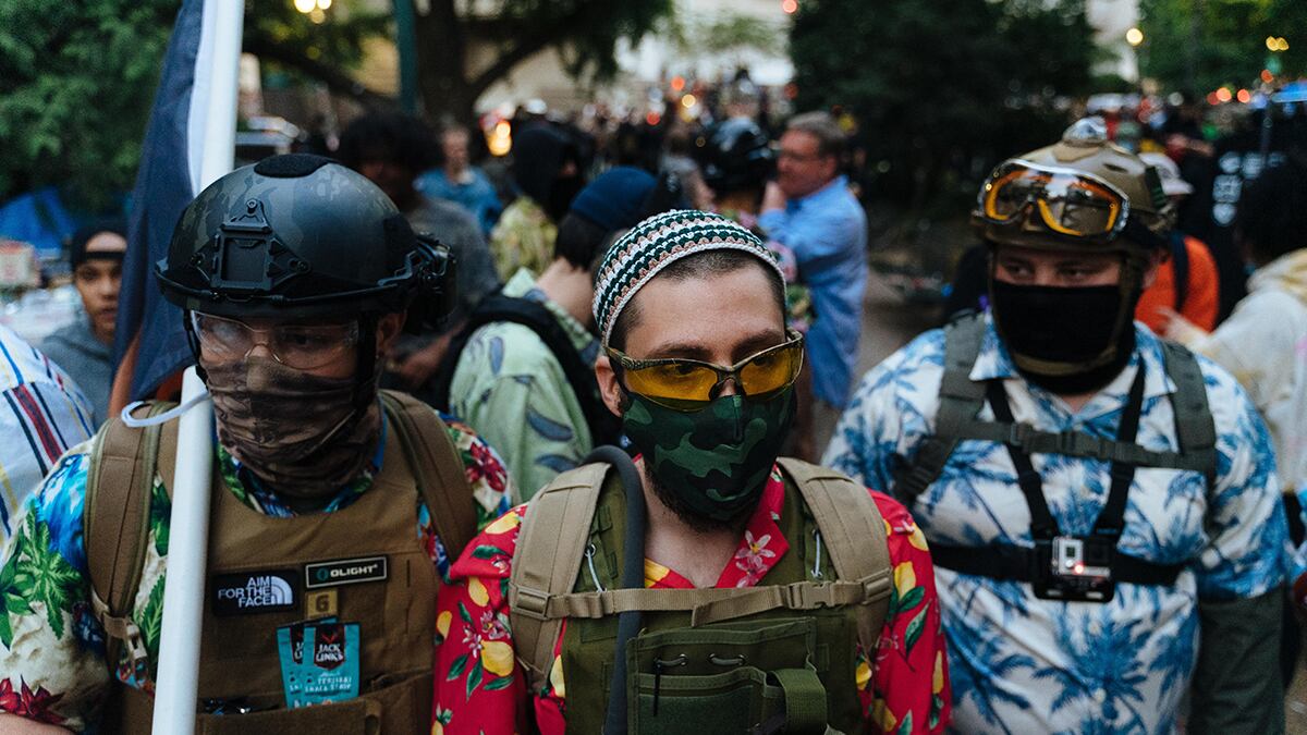I’m out covering Portland protests tonight. The boogaloo boys have arrived. They tell me they are here in support of Black & trans lives. “Fuck the feds,” one told me. They say they’re here to protect protesters. pic.twitter.com/zuHqMM8Fou