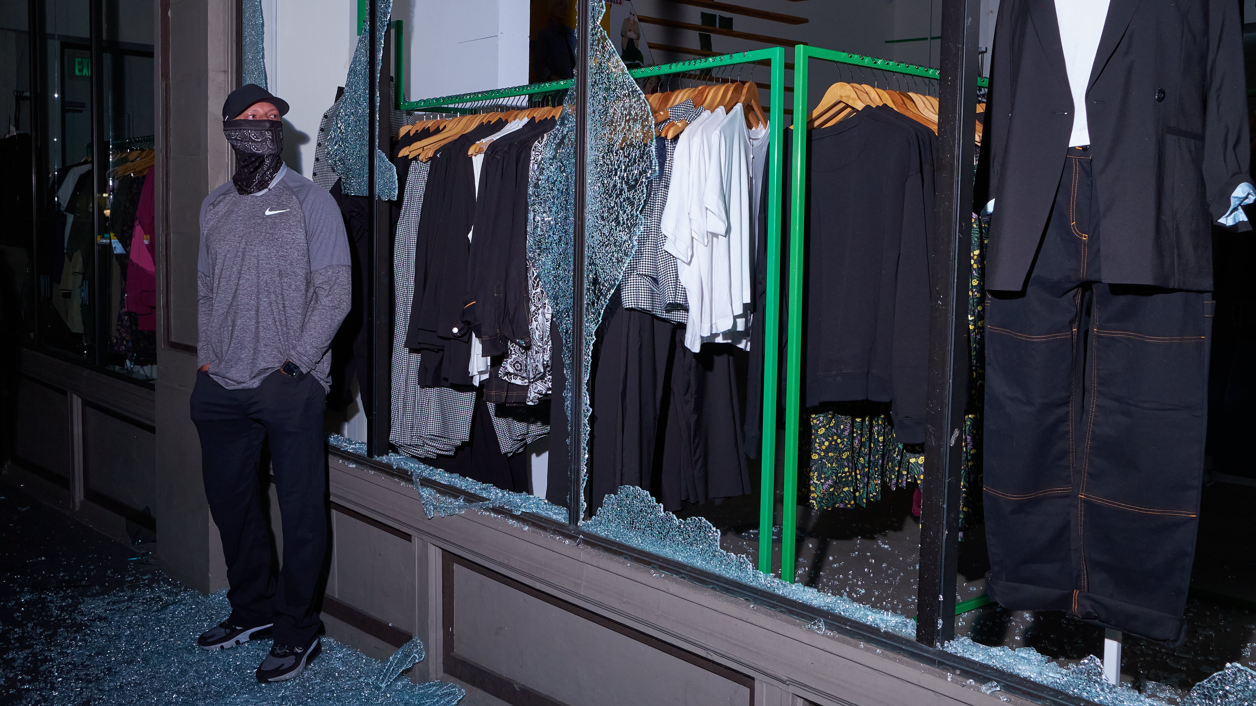 A business owner on Southwest Harvey Milk Street started boarding up a smashed window as police continued to push demonstrators away.