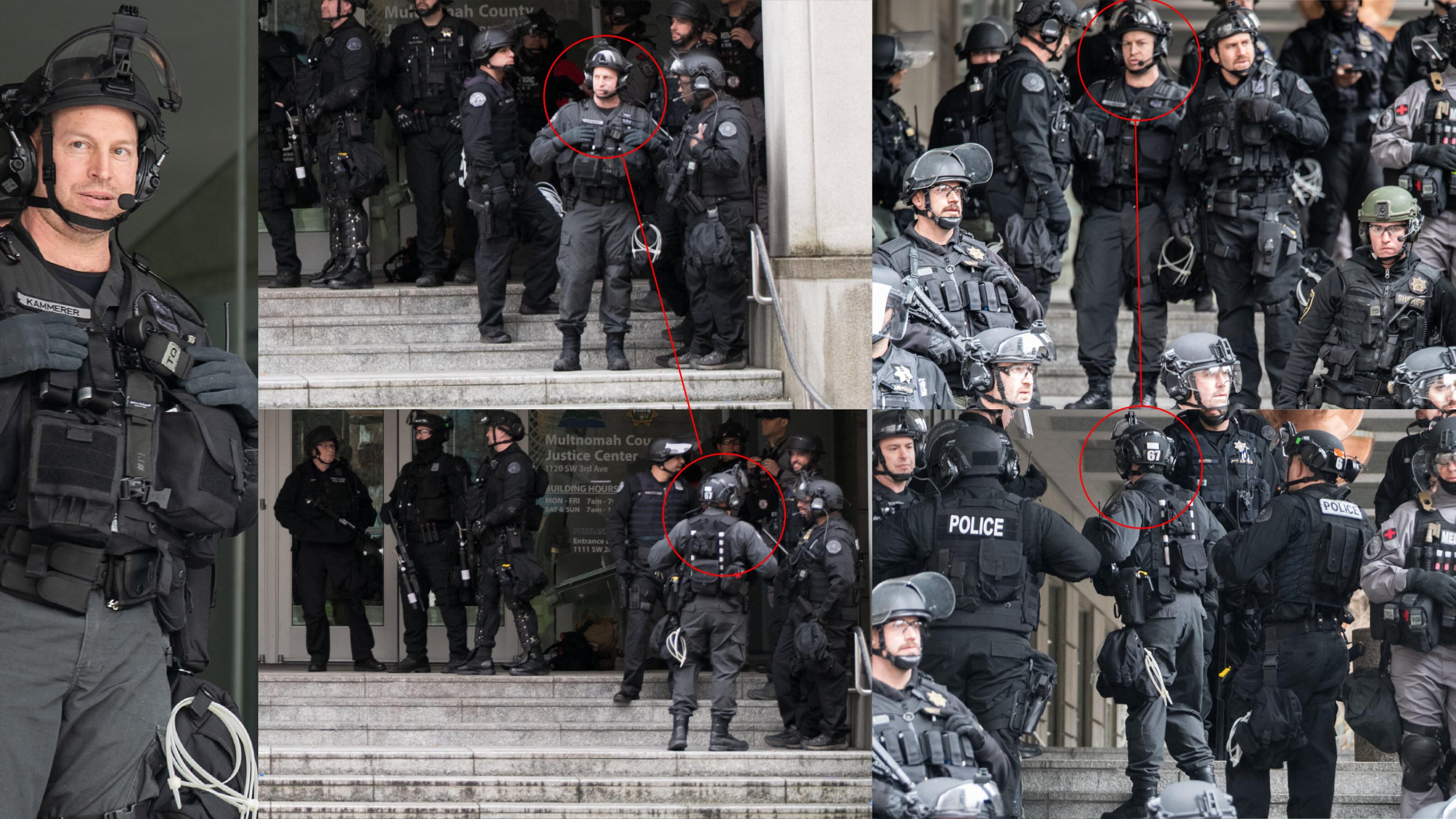 But the press has no contract with the Portland Police Association. Photographs and three eyewitness accounts identify the officer wearing helmet number 67 as Detective Erik Kammerer.