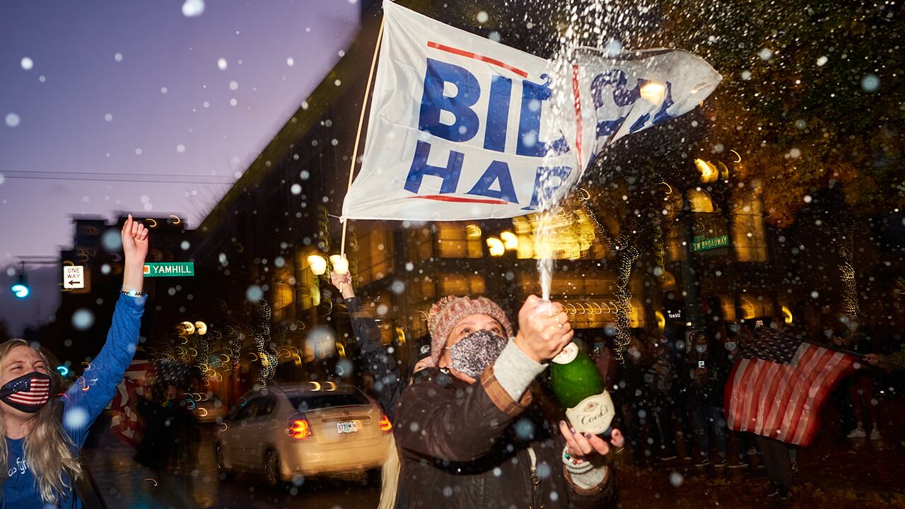 In the hours after news outlets declared former Vice President Joe Biden the next president, Portlanders shot fireworks, honked car horns, and held champagne parties in city parks. Residents of Pearl District condo towers banged pots and pans outside their windows, an echo of the nightly ritual of thanking hospital workers and first responders at the start of the pandemic.