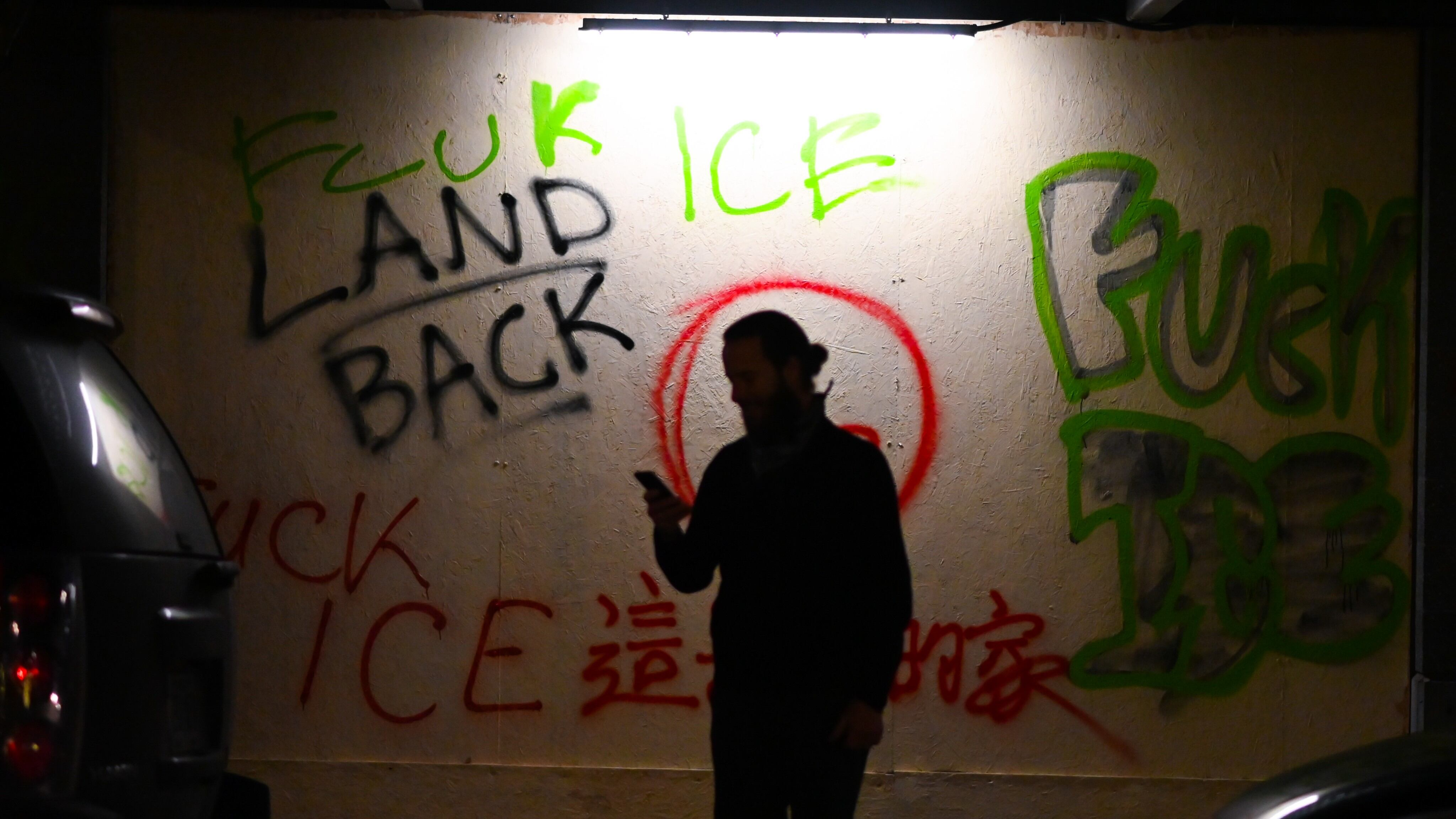 Upon arriving at the USCIS office, some members of the crowd began spray-painting the plywood panels of the boarded-up office while others provided cover from security cameras, using umbrellas and laser pointers. Protesters covered the sides of the building with slogans, such as "No Kids in Cages," and the names of "Breonna Taylor" and "Tete Gulley." Within minutes, the action was over.