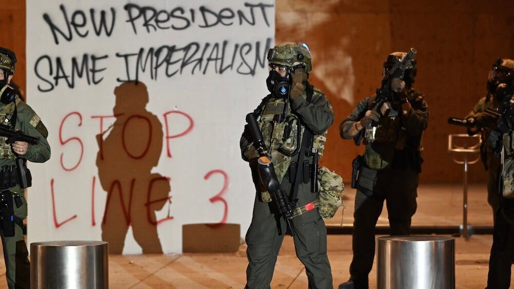 On Thursday night, the crowd that assembled in front of the federal courthouse had a strong vibe of provocation: looking to resume hostilities with the federal officers inside. Participants said the gathering was a continuation of a daytime march to call attention to the proposed Enbridge Line 3 crude oil pipeline expansion through Minnesota and territories of the Anishinaabe tribes.