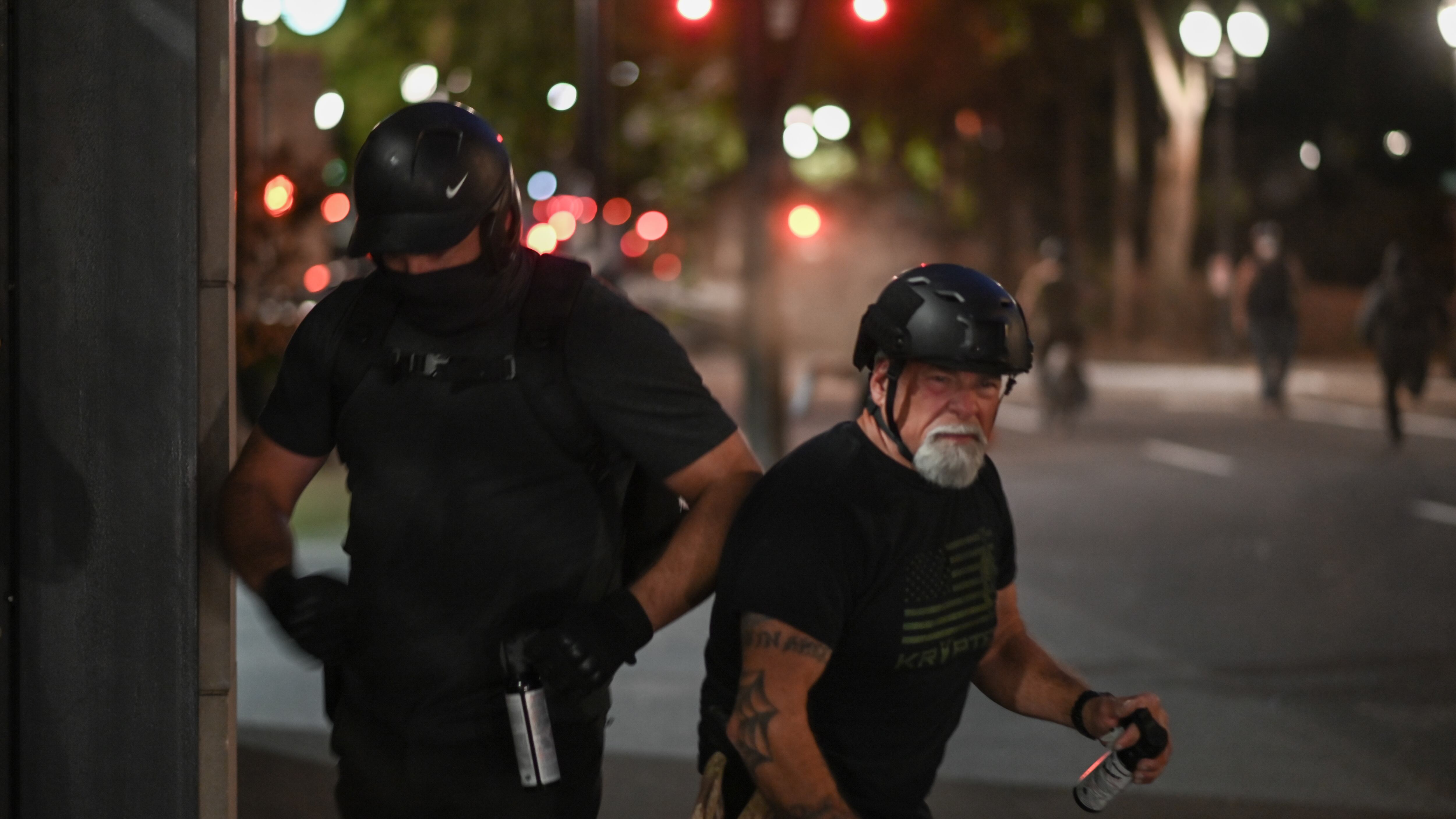The next day—Aug. 8—Grace attended the Feucht concert where he deployed bear mace at leftist counterprotesters—some of whom maced him in return. He wore a black helmet and carried a baton.