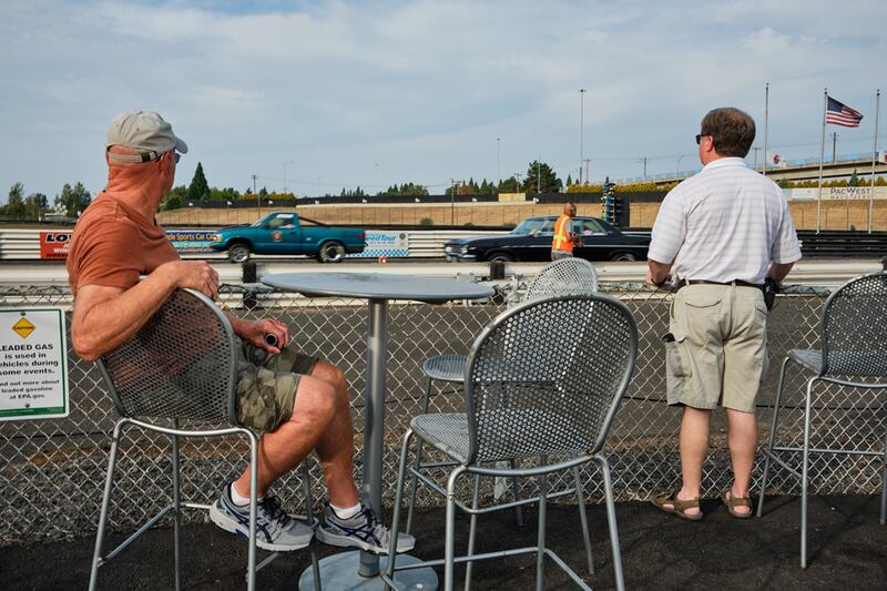 John Waleske, 72, watches as two cars nose their way to the starting line. The drivers gun their engines and spin their tires. “I used to work with that guy at the Camas paper mill,” Waleske says, nodding toward a racer in the line.
