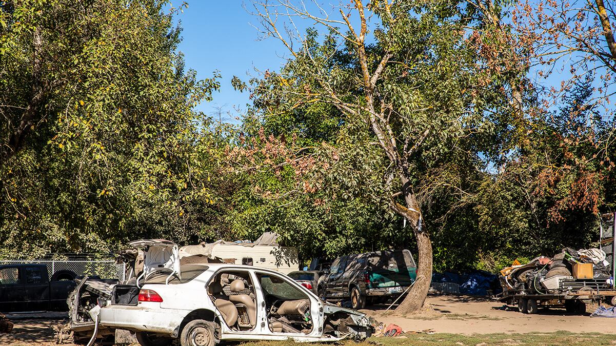 Hot spots around the city—sometimes associated with homeless camps—often have half a dozen cars in various stages of disrepair and dismemberment in the open air.