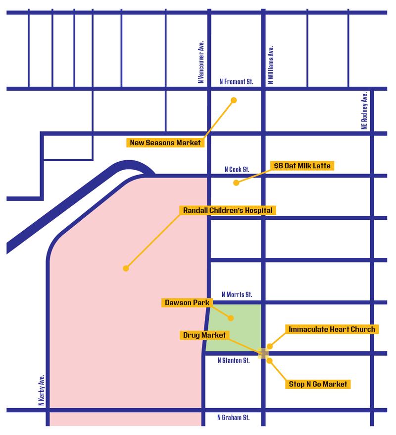 Dawson Park, located in the heart of the Eliot neighborhood in North Portland, is 2 acres of oak trees and green grass. Five blocks away stands a New Seasons and a Pilates studio. Three blocks away, you can buy a $6 oat milk latte. Nearby, an apartment building is charging $2,400 a month for one-bedroom units.