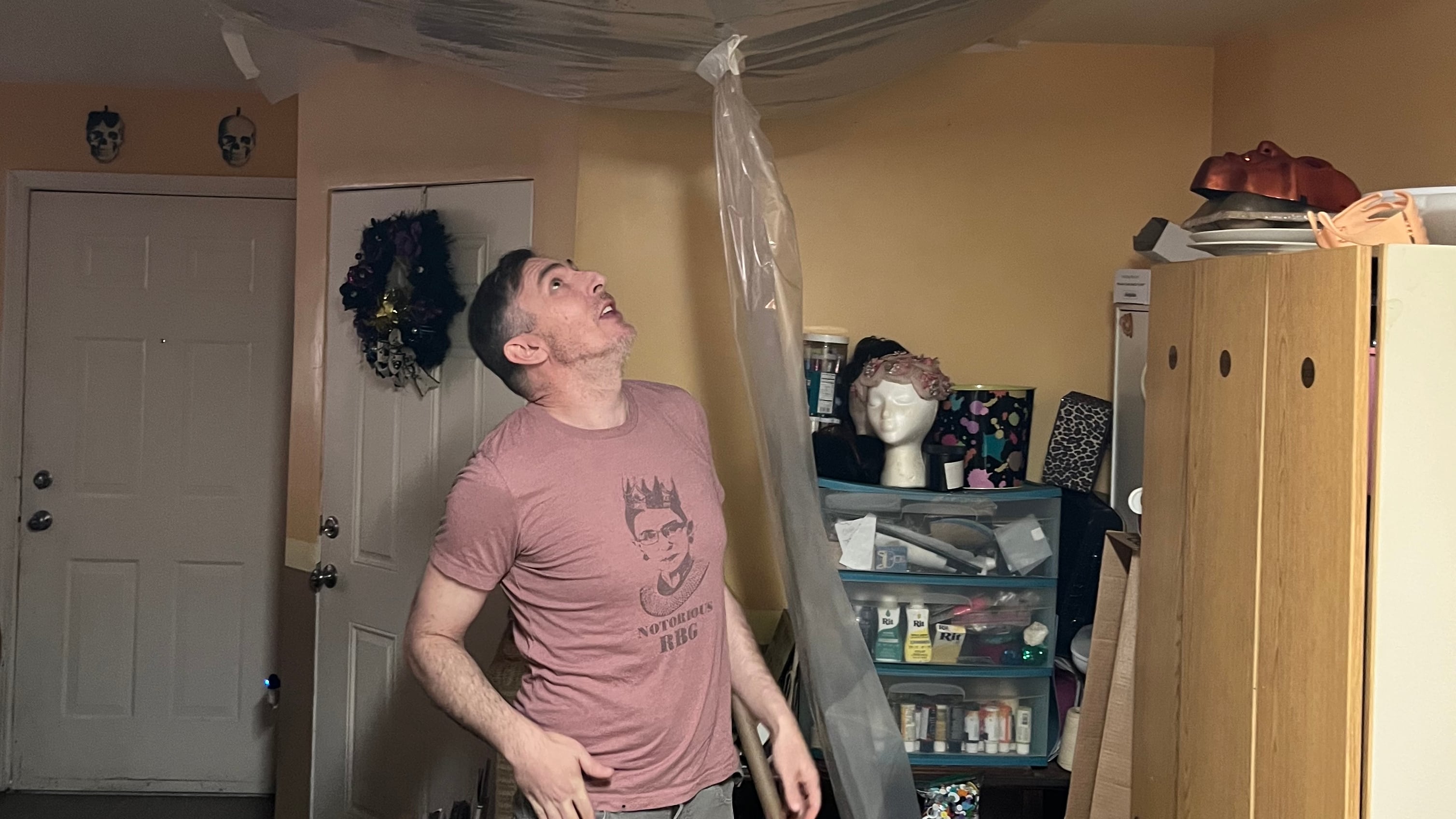 The GHB episode happened a month later, and water has been dripping from different parts of his ceiling like Oregon rain ever since. In mid-October, the paint on his kitchen ceiling bubbled. Contractors arrived and found the drywall soaked. They removed it and covered the 8-by-10-foot hole with plastic sheeting. A jury-rigged funnel directs water into a trash can.