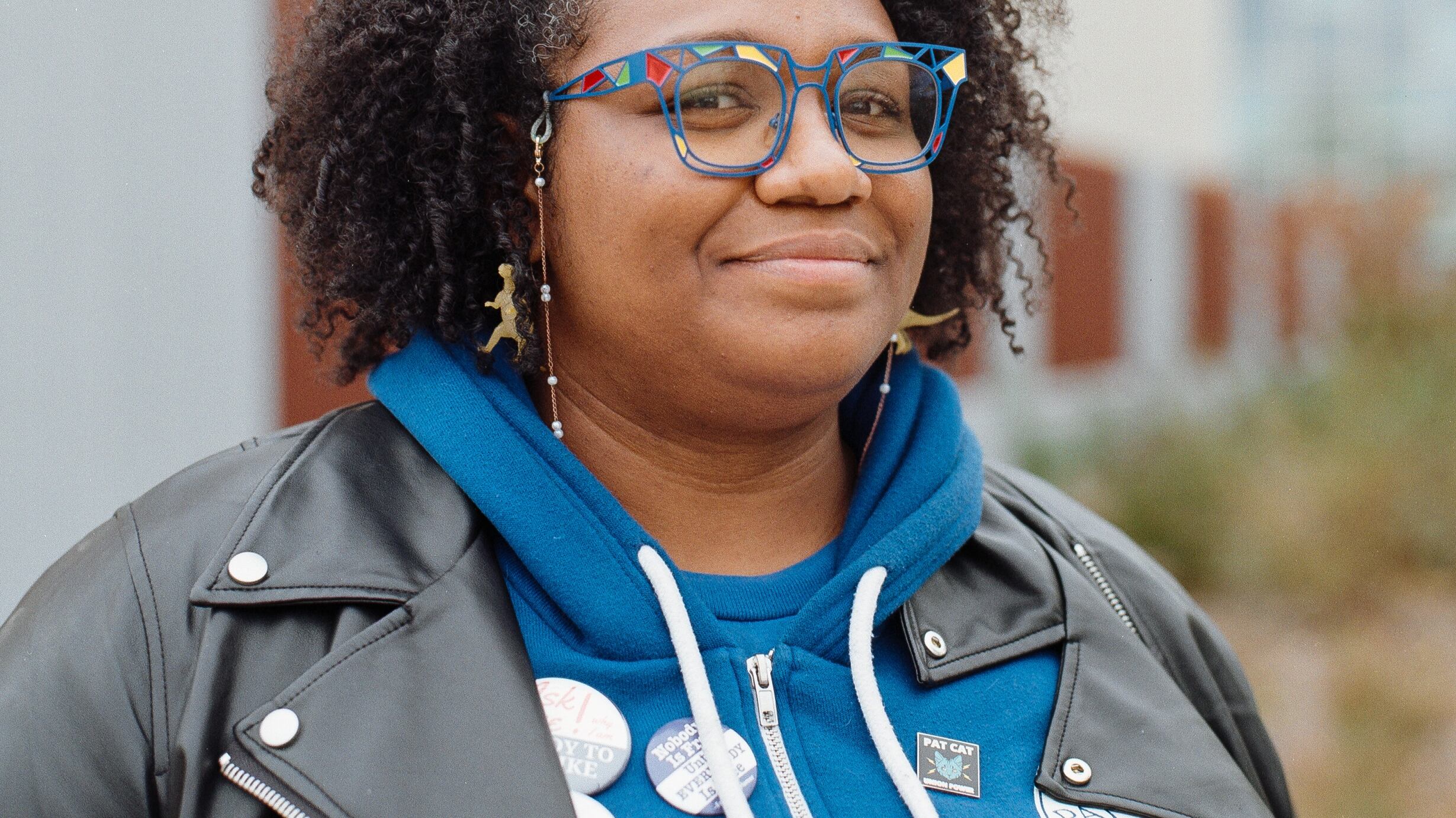 About 50 teachers and parents were walking the picket line on Northeast Prescott Street, chanting “Union! Strong!” when Bonilla appeared. She wore a black moto jacket over a blue Portland Association of Teachers hoodie and glasses with bold mosaic-print frames.