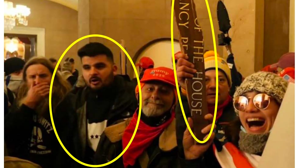 For example, the FBI said in a statement that Medina appears to have broken a prominent wooden sign in the Capitol. Video shows the man who appears to be Medina “slamming a wooden sign affixed above the Speaker’s office, which read ‘Speaker of the House, Nancy Pelosi,” in an attempt to break it,” the statement says. “Medina is then seen standing next to rioters who are holding up pieces of the shattered wooden sign with partial lettering visible, spelling ‘of the House’ on the top line, and ‘Nancy P’ on the lower line.”
