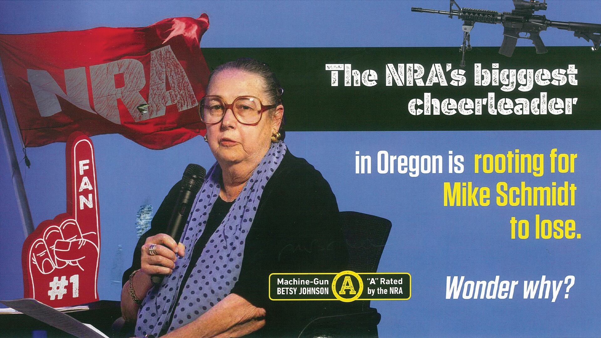 No offense to kids and their art, but in another winner from the Working Families Party, we’re treated to a jumble of images, including “Machine Gun” Betsy Johnson holding a microphone, an NRA flag, an assault rifle, and (the best part) a big red foam finger that reads “#1 FAN,” in case it’s not clear that Johnson loves the National Rifle Association. What does this have to do with Mike Schmidt, the supposed beneficiary? “The NRA’s biggest cheerleader in Oregon is rooting for Mike Schmidt to lose,” the flyer says. It’s true that Johnson’s political action committee contributed to Vasquez, but that message is lost in so much laughable Photoshop work.