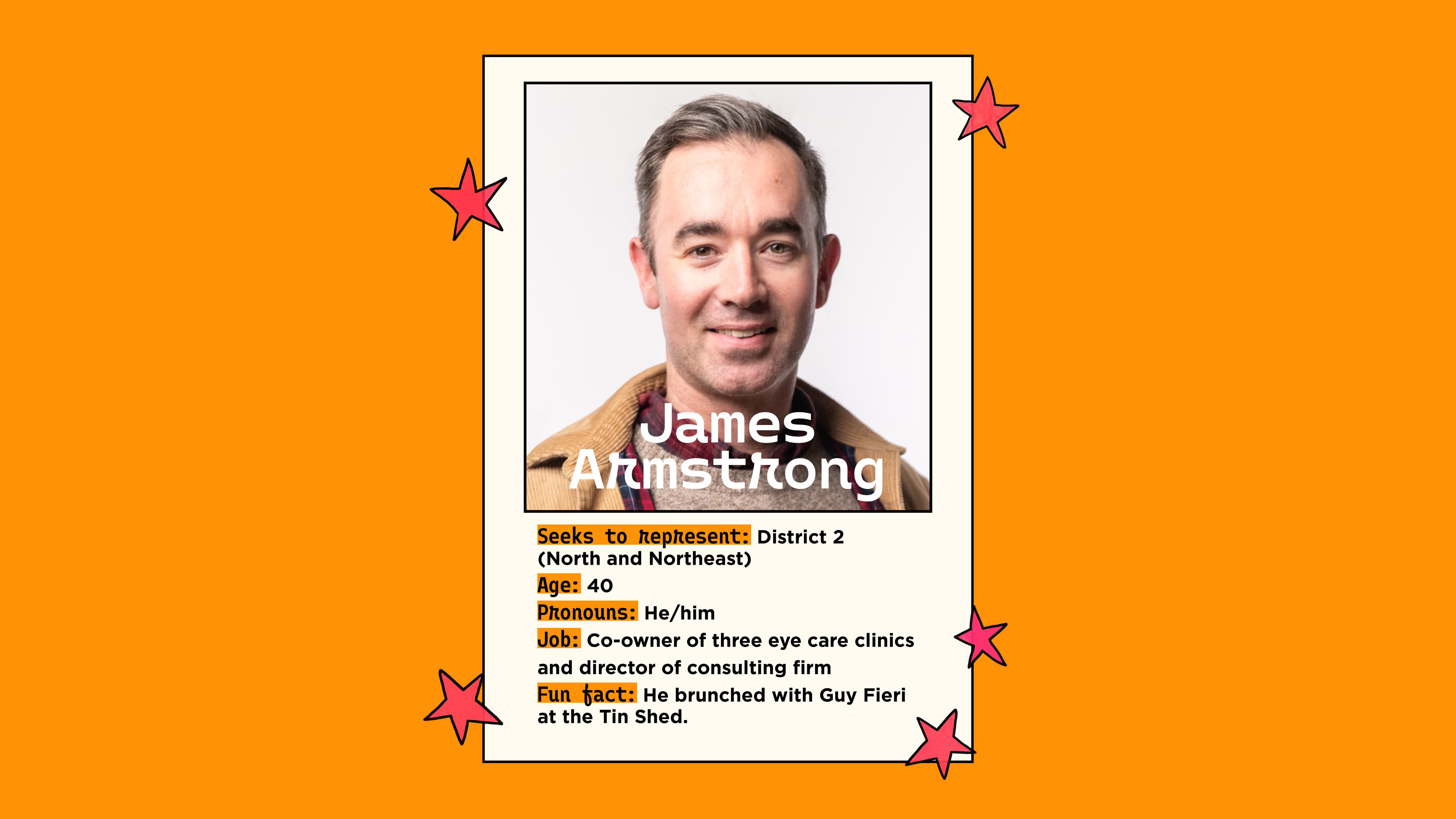 James Armstrong: Number one is the homelessness crisis. For me, it’s bringing practical solutions, trying to really move the ball forward on getting people into permanent housing, getting them to support services. Number two, I really would like to see the city do a better job of supporting small businesses, not just focus on how big businesses are supported. Third, voters are frustrated with where their tax money is going, and I would really like to help restore confidence that the city can effectively use our valuable resources to provide services that people want.