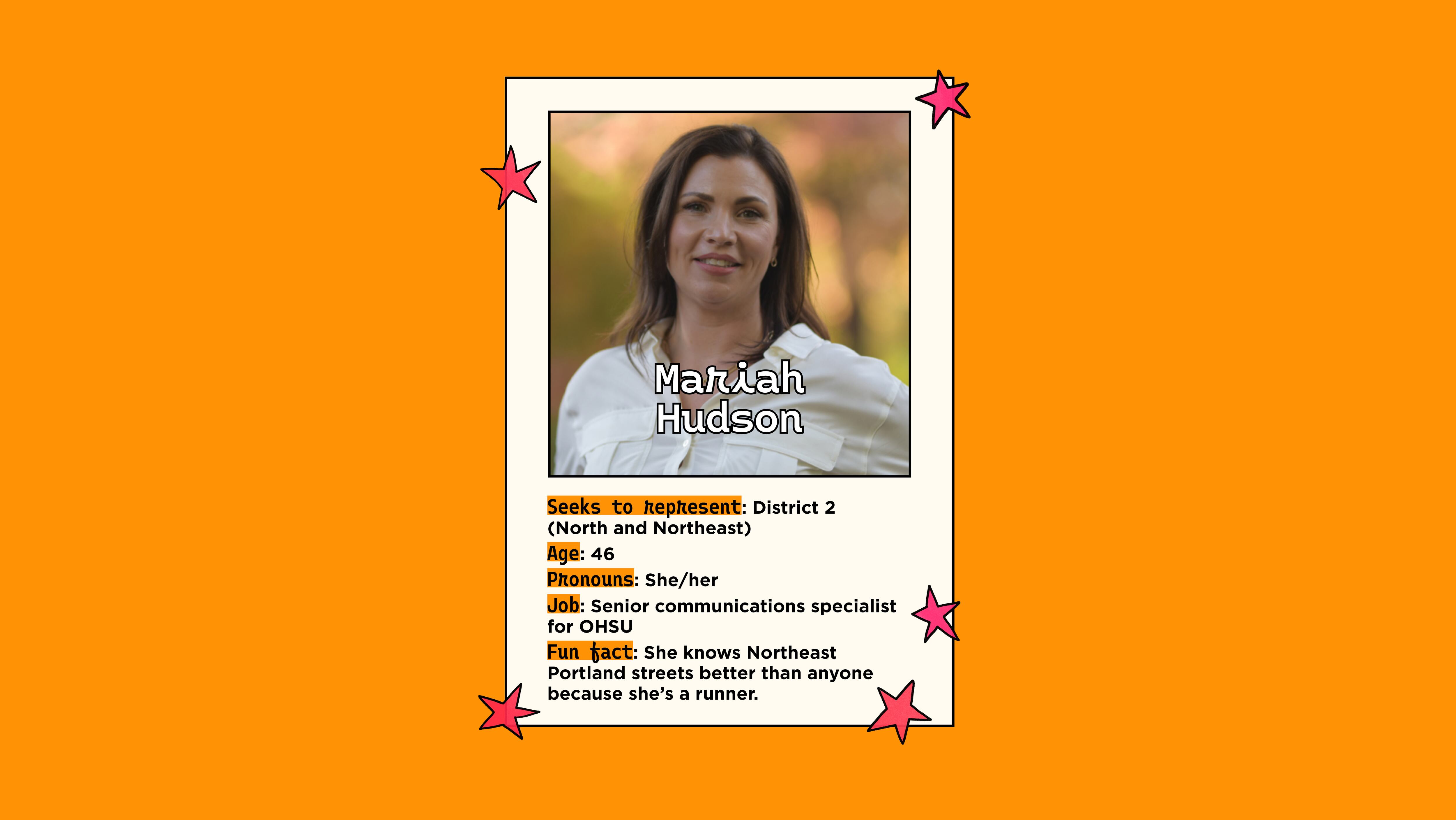 Mariah Hudson grew up in Eugene, but as a kid she came to Portland often to go to punk shows. Now she’s been living in the city for more than a decade and is running for a seat representing District 2 so that her kids can enjoy the city as much as she did while growing up.