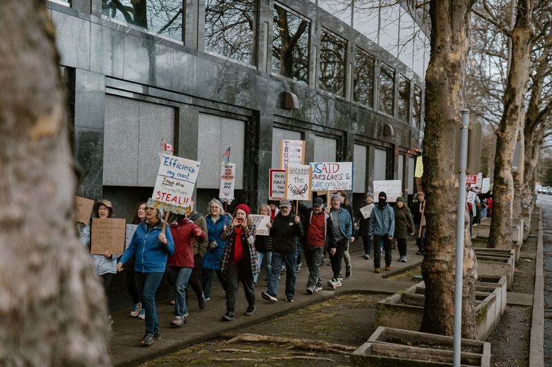 The Feb. 19 “Save Our Services” rally, shown here in photos by Brian Brose, included appearances by U.S. Rep. Maxine Dexter (D-Ore.) and Portland City Councilor Angelita Morillo, who called for greater protections for federal benefits and workers.