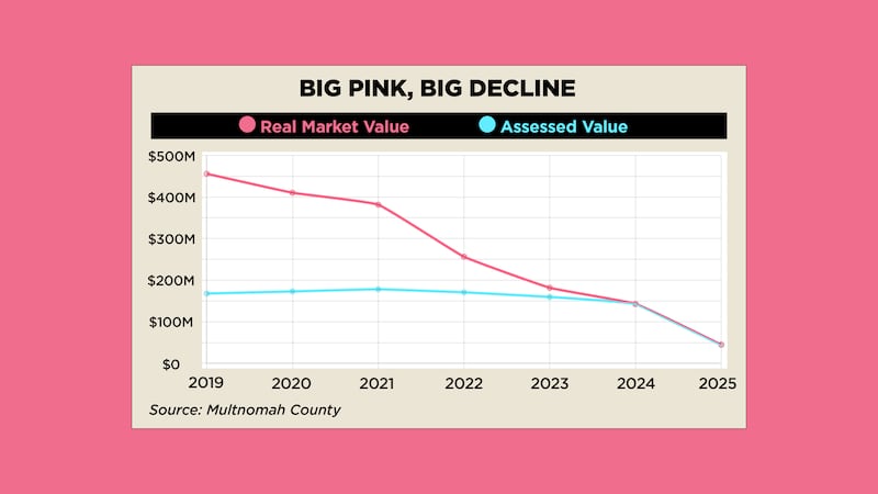 The real market value of Big Pink peaked in 2019 at $456 million, according to county records. That year, though, its maximum assessed value was just $168 million because that value could only rise 3% a year, per Measure 50, while real market value could go through the roof. That meant Big Pink’s owners only paid tax on the assessed value of $168 million. Their bill was $4.3 million.