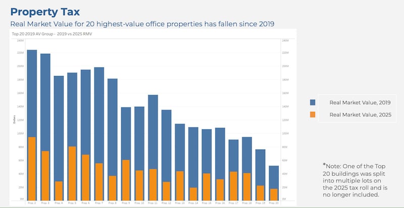The real market value for the 20 most valuable office buildings in Portland have all fallen since 2019, the year before COVID-19 struck Oregon and protests over the murder of George Floyd turned into riots that prompted downtown landlords to board up windows. The declines are leading to lower tax collections on commercial real estate.