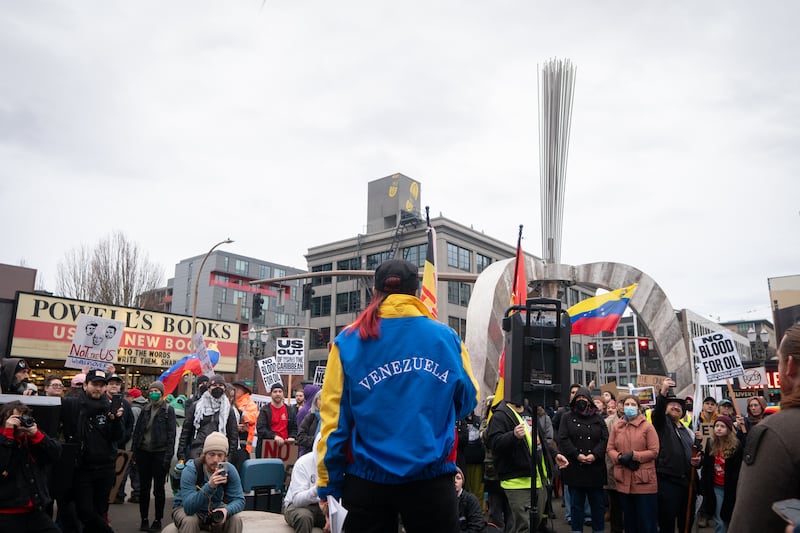 Advocacy groups organized two rallies on Saturday afternoon before joining forces to march from Powell’s City of Books to the Willamette riverfront. Their opposition to regime change in the socialist South American country was largely echoed by local elected officials.