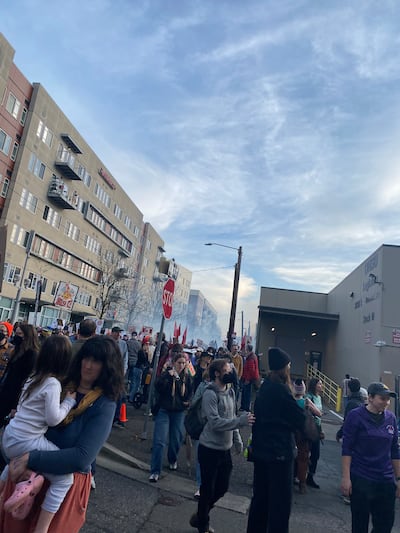 And then the march started and we kind of walked through the park and then joined up with folks. We were on Abernethy and Moody, and I was texting with my dad—like, Hey, where are you? And as soon as we made contact, he was like, Did you hear those bangs? And we had. We heard loud bangs maybe two blocks up. After the bangs, we saw these big clouds of yellow smoke.