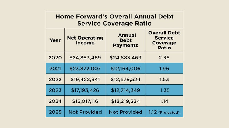 The 2024 number is a steep decline from Home Forward’s debt service coverage ratio of 2.36 in 2020 (see table below). In other words, Home Forward had twice what it needed to cover its debts just five years ago—and now that number has fallen by half.