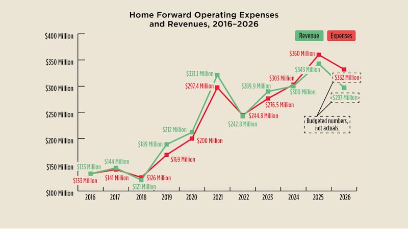 About two-thirds of Home Forward’s operating revenue in any given year comes from HUD, primarily in the form of rental assistance vouchers. Federal funding for vouchers, the agency says, is expected to remain relatively flat while the cost of providing those vouchers has dramatically increased. That’s a large reason why Home Forward says its budget is an estimated $30 million in the red in the current fiscal year (see graph above).